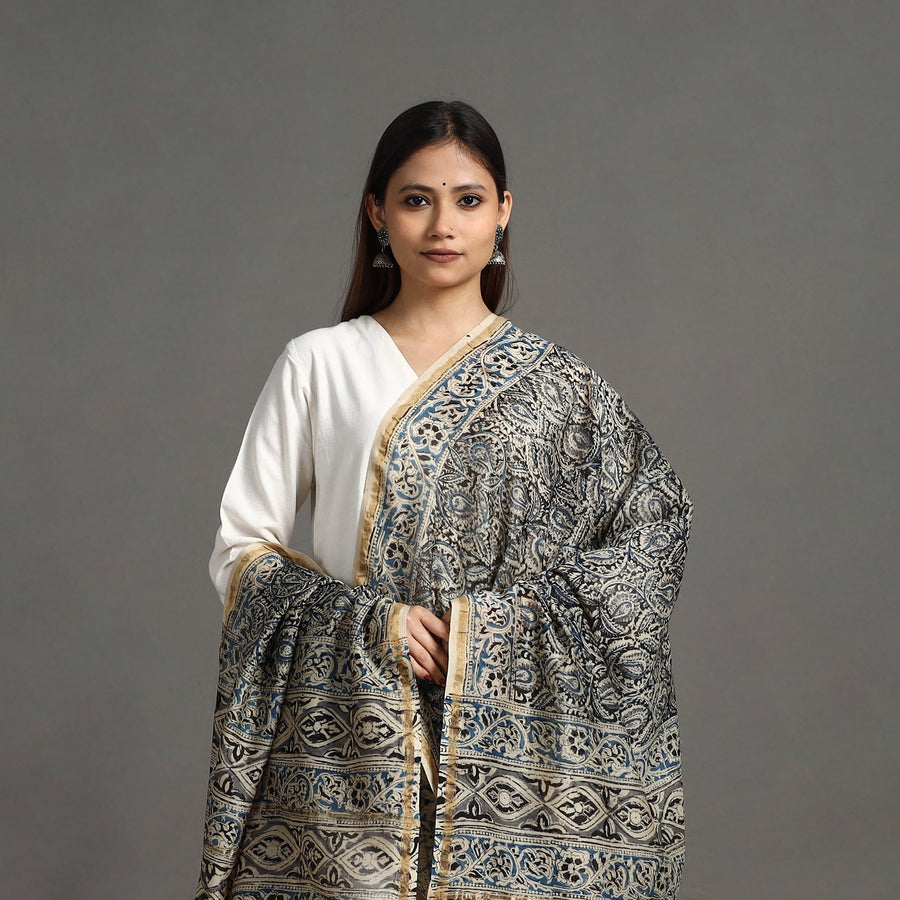 This exquisite block print chanderi silk cotton black kalamkari dupatta with zari border is skillfully crafted by the artisans of Pedana. This handloom dupatta is adorned with intricate hand block printed designs using natural dyes, an identification of authentic Kalamkari artistry. Kalamkari is the earliest and more complex technique of block printing. This dupatta is versatile for both casual and formal occasions, infusing your ensemble with heritage charm.