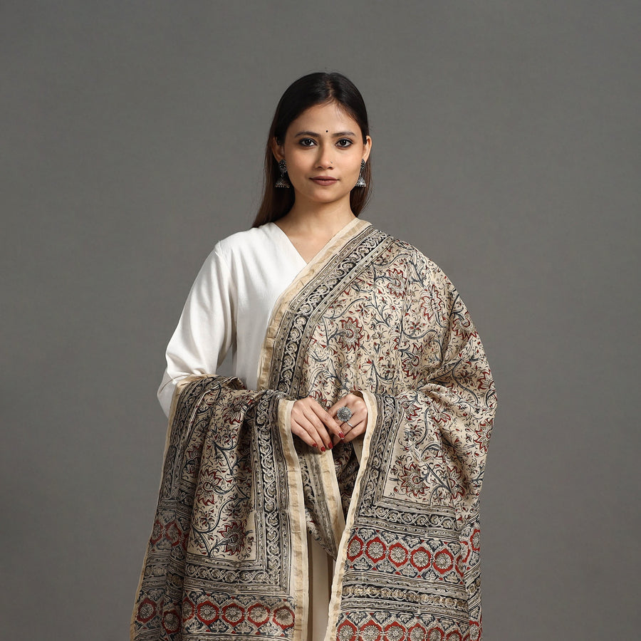 This exquisite block print chanderi silk cotton beige kalamkari dupatta with zari border is skillfully crafted by the artisans of Pedana. This handloom dupatta is adorned with intricate hand block printed designs using natural dyes, an identification of authentic Kalamkari artistry. Kalamkari is the earliest and more complex technique of block printing. This dupatta is versatile for both casual and formal occasions, infusing your ensemble with heritage charm.