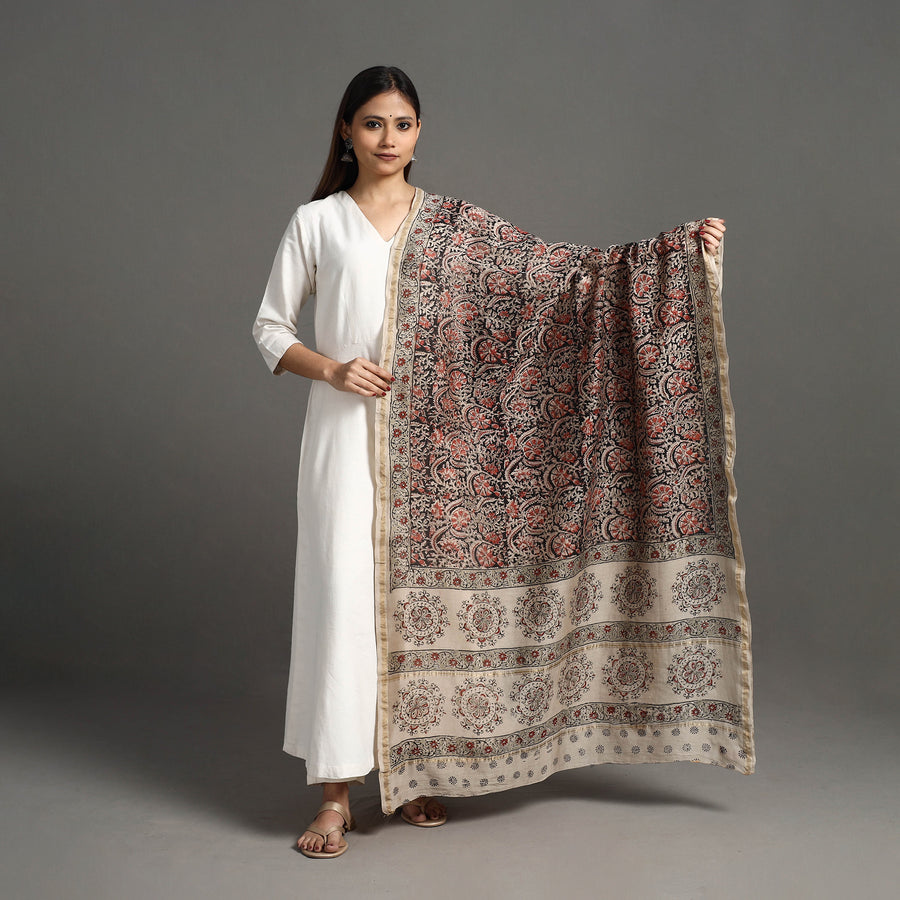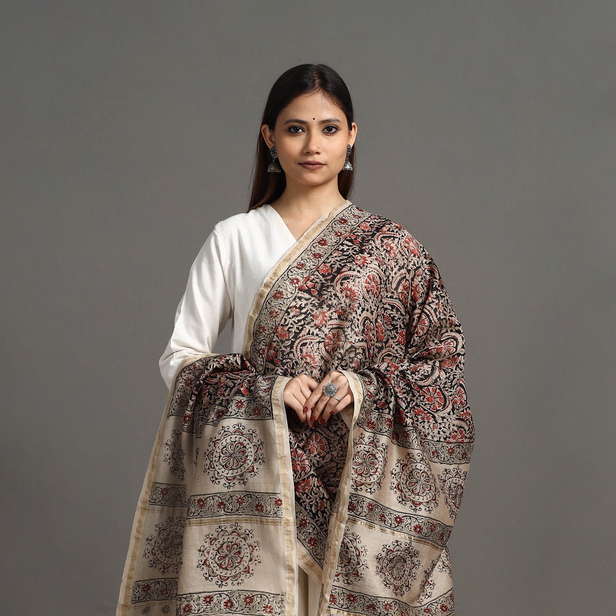 This exquisite block print chanderi silk cotton black kalamkari dupatta with zari border is skillfully crafted by the artisans of Pedana. This handloom dupatta is adorned with intricate hand block printed designs using natural dyes, an identification of authentic Kalamkari artistry. Kalamkari is the earliest and more complex technique of block printing. This dupatta is versatile for both casual and formal occasions, infusing your ensemble with heritage charm.