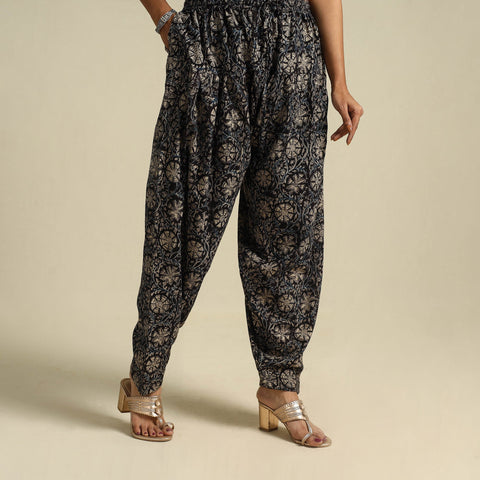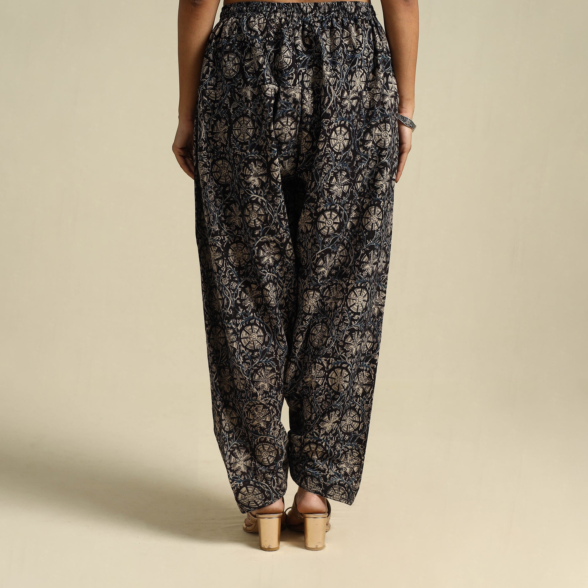 Experience the heritage of black pedana kalamkari with this cotton salwar, hand block printed using age-old natural dye techniques from Andhra Pradesh. Designed with an elastic waist, drawstring tie, and a convenient side pocket, it offers both comfort and utility. Perfect for relaxed ethnic dressing or casual days out. Complete the look by pairing it with your favourite kurta.