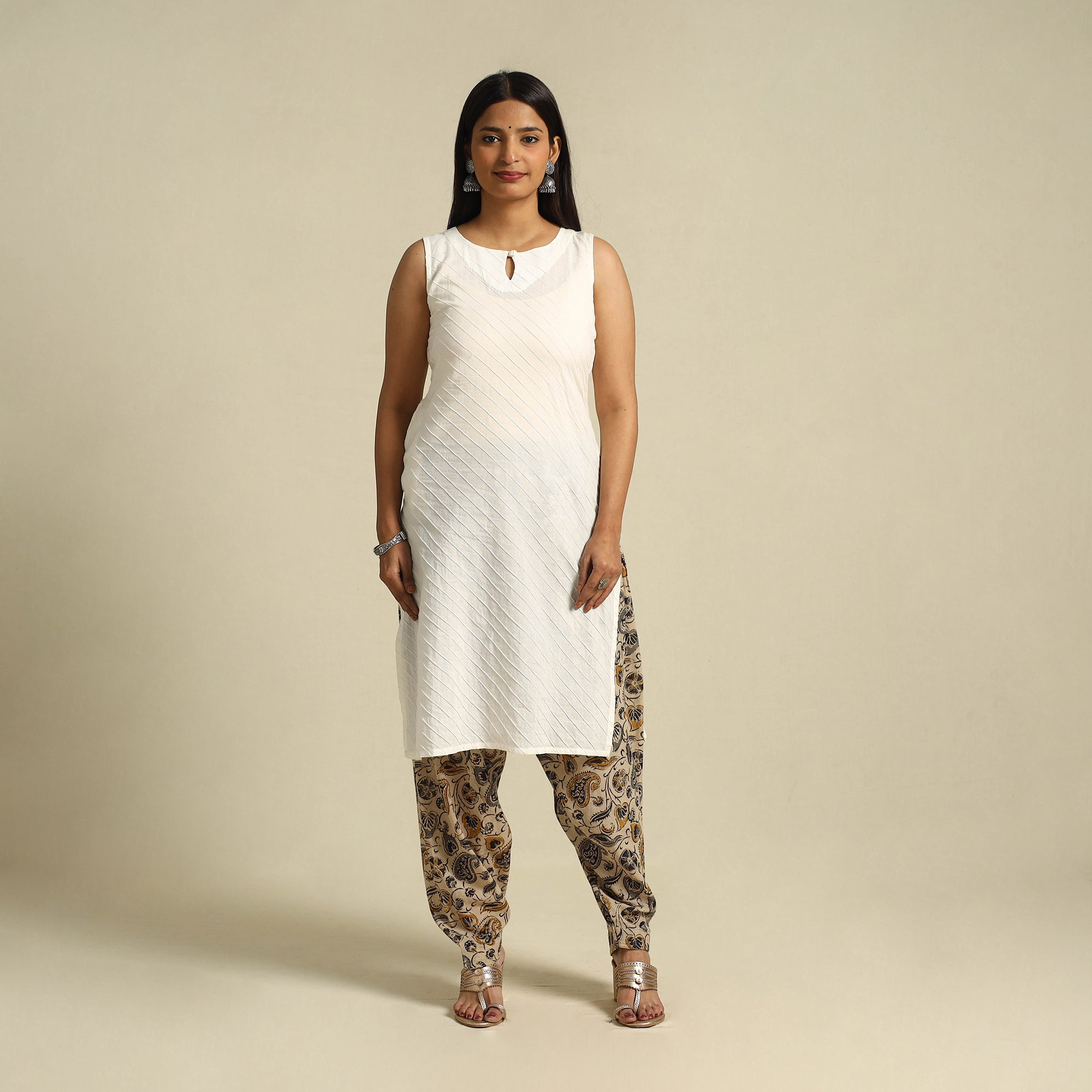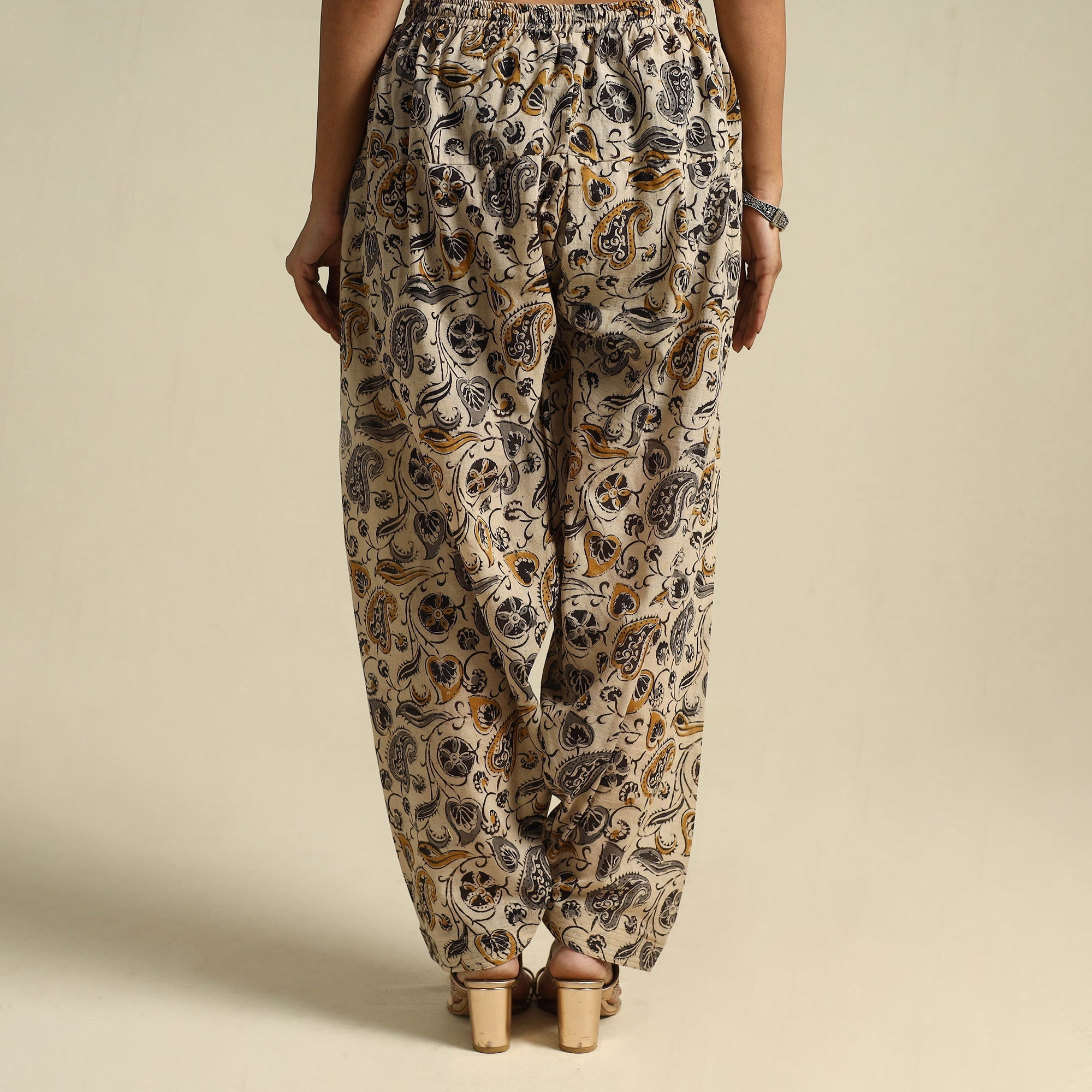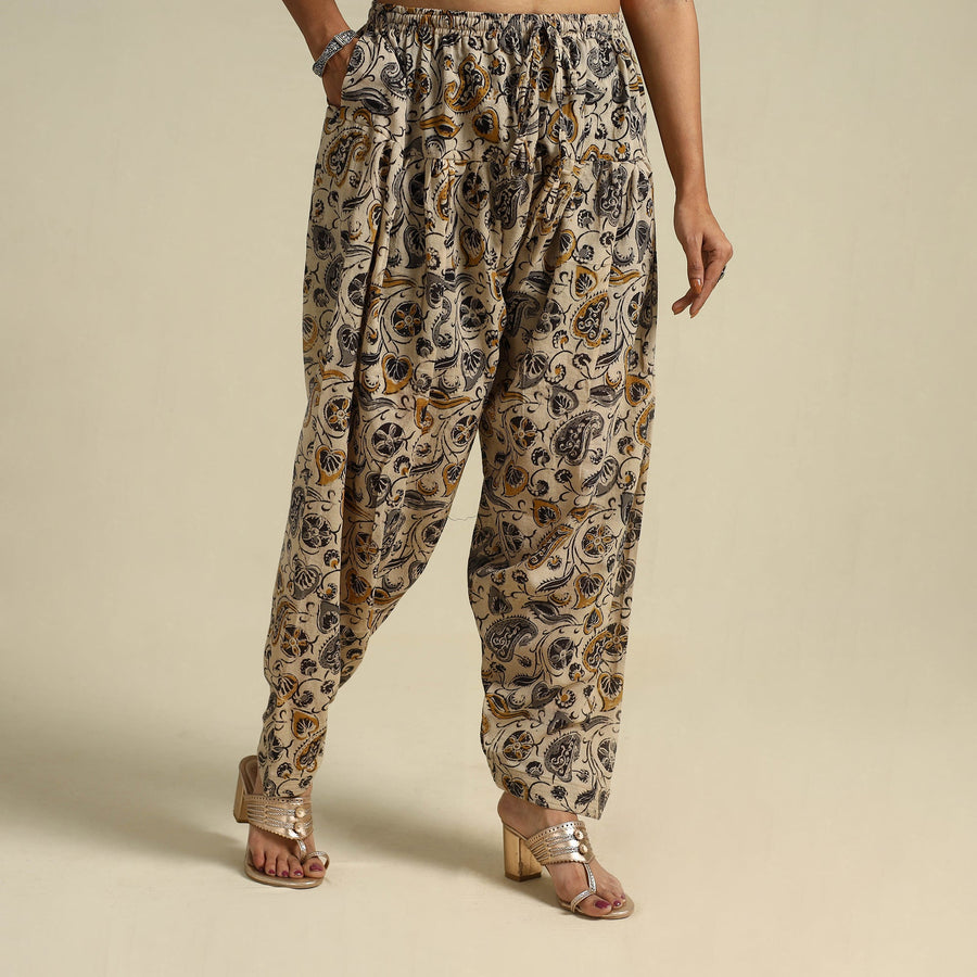 Experience the heritage of beige pedana kalamkari with this mul cotton salwar, hand block printed using age-old natural dye techniques from Andhra Pradesh. Designed with an elastic waist, drawstring tie, and a convenient side pocket, it offers both comfort and utility. Perfect for relaxed ethnic dressing or casual days out. Complete the look by pairing it with your favourite kurta.