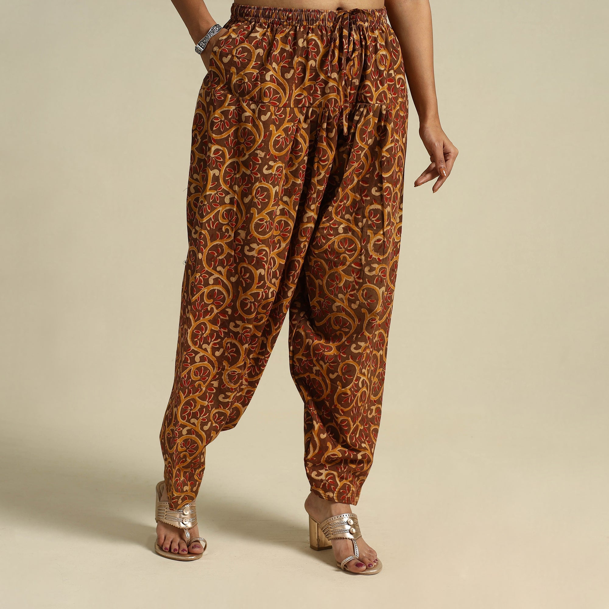 Experience the heritage of brown pedana kalamkari with this cotton salwar, hand block printed using age-old natural dye techniques from Andhra Pradesh. Designed with an elastic waist, drawstring tie, and a convenient side pocket, it offers both comfort and utility. Perfect for relaxed ethnic dressing or casual days out. Complete the look by pairing it with your favourite kurta.