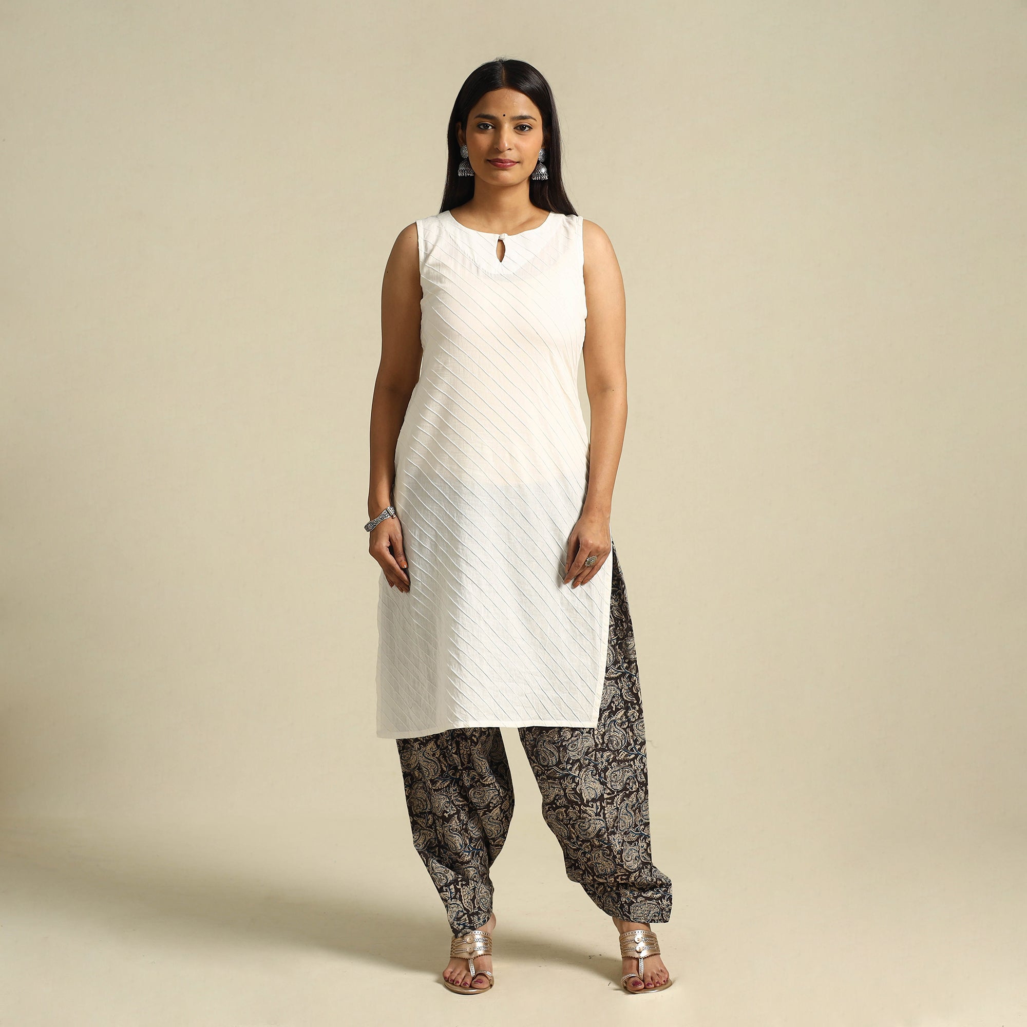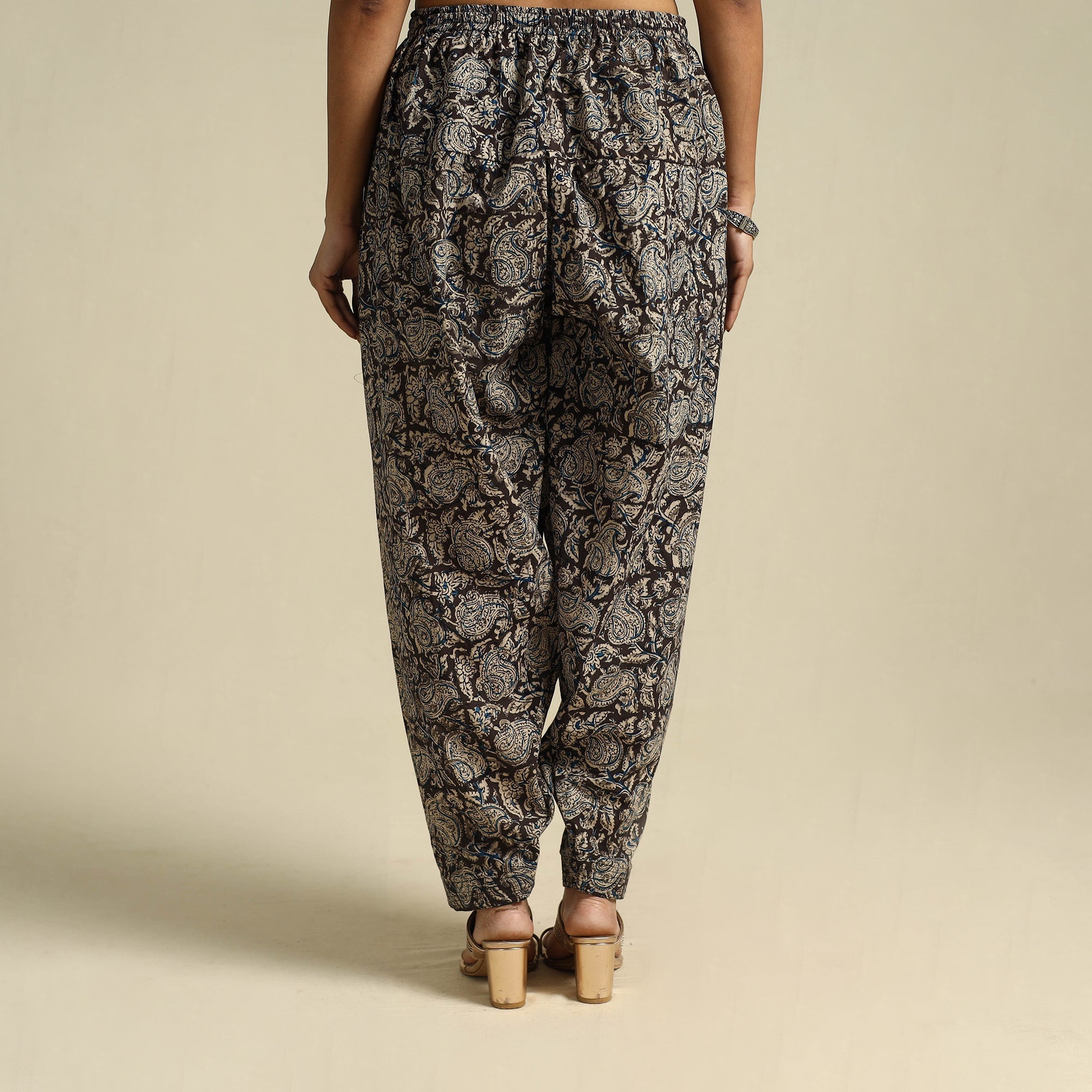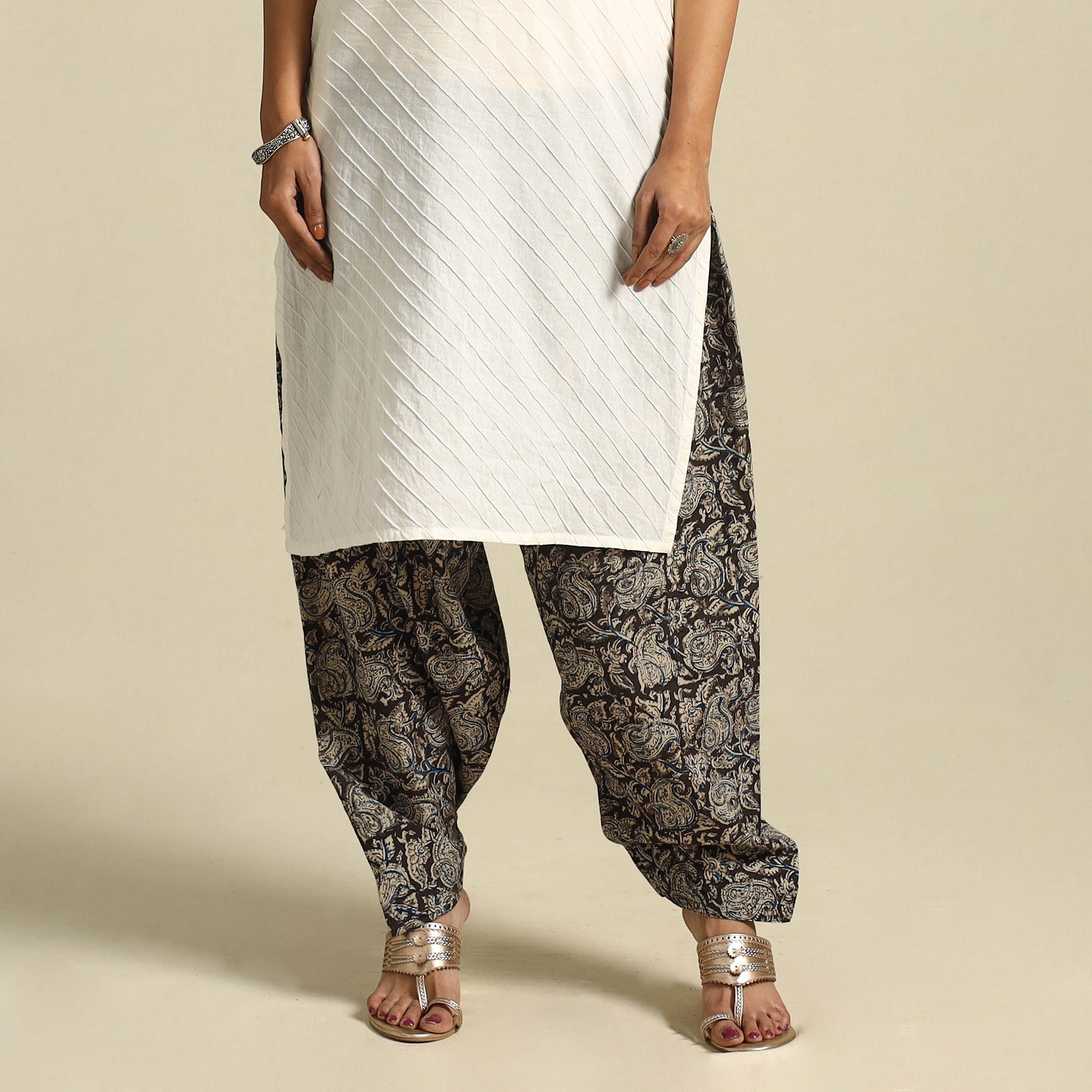 Experience the heritage of black pedana kalamkari with this cotton salwar, hand block printed using age-old natural dye techniques from Andhra Pradesh. Designed with an elastic waist, drawstring tie, and a convenient side pocket, it offers both comfort and utility. Perfect for relaxed ethnic dressing or casual days out. Complete the look by pairing it with your favourite kurta.