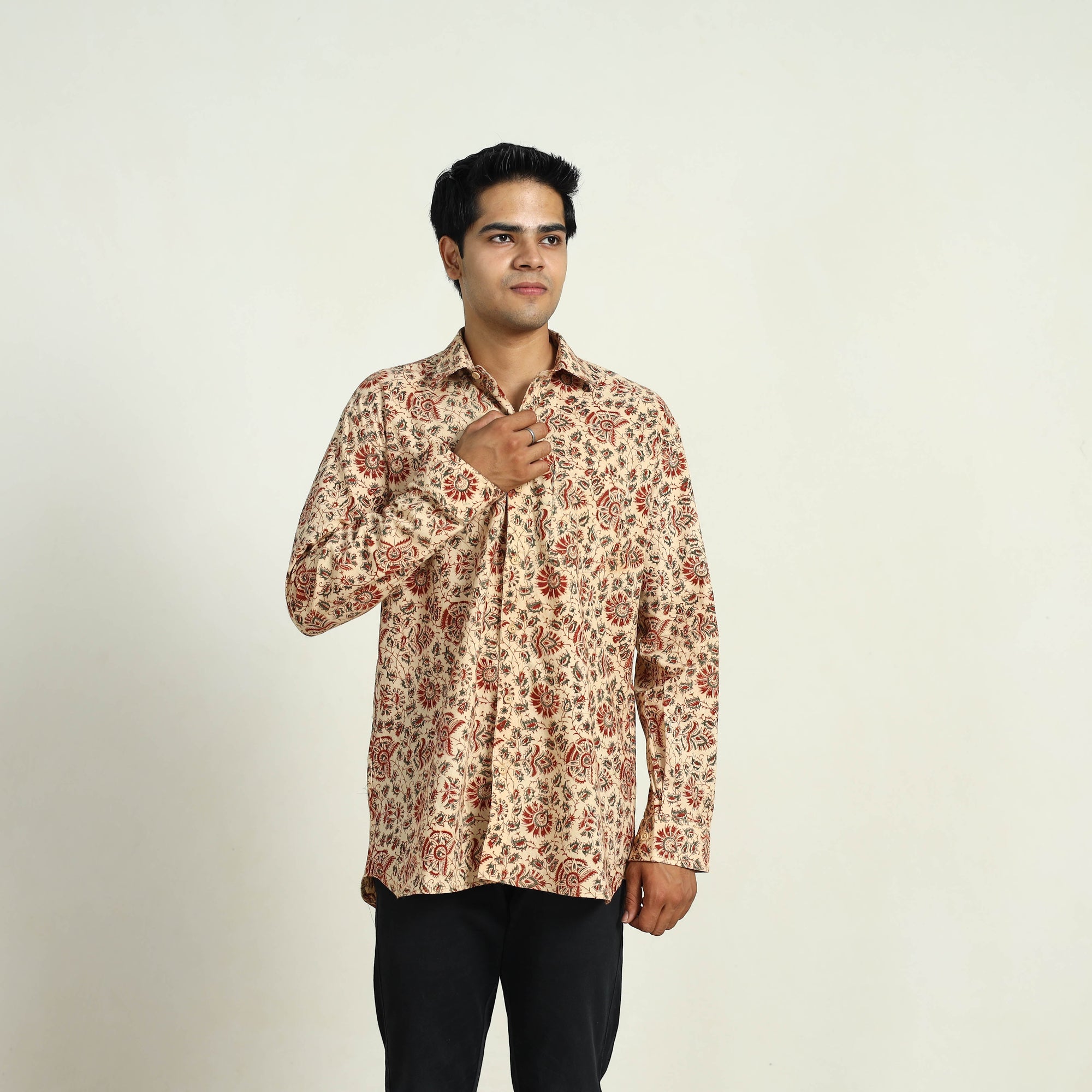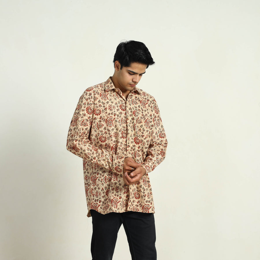 Hand-printed with classic pedana block print cotton men kalamkari shirt. Made from cotton, it features intricate block prints. The shirt’s full-sleeve design and wooden buttons add a natural touch, while the patch pocket offers practicality. Perfect for casual outings or semi-formal occasions.