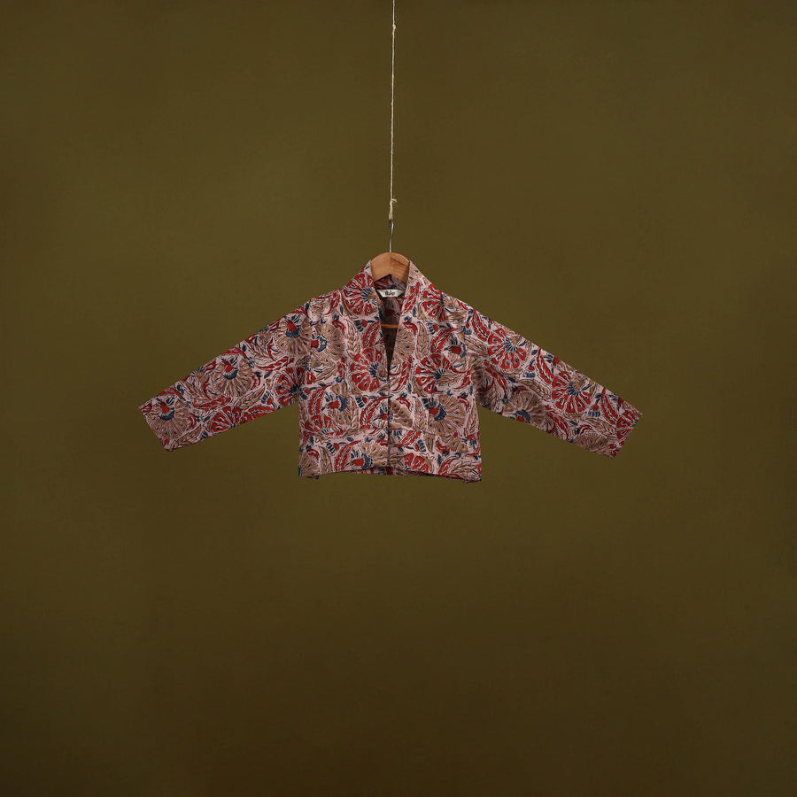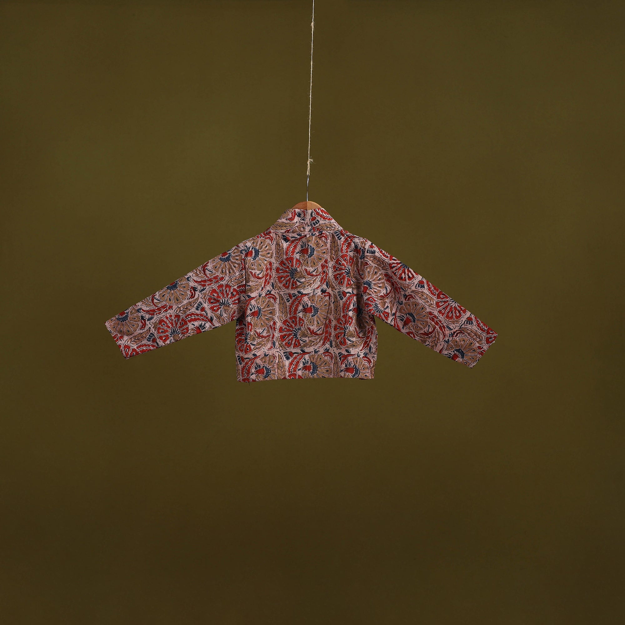 Pedana kalamkari pure cotton readymade blouse features traditional hand block printed motifs created by skilled artisans. Hand-carved wooden blocks are dipped in natural dyes and pressed onto the fabric to form kalamkari pattern. Designed with a front hook closure, this blouse pairs well with both everyday and occasion sarees.
