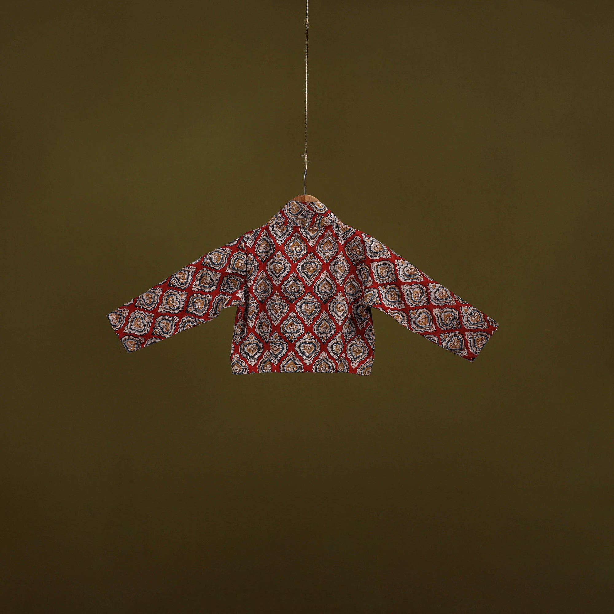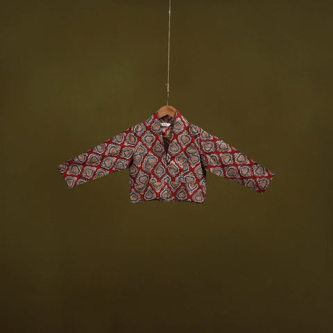 Pedana kalamkari pure cotton readymade blouse features traditional hand block printed motifs created by skilled artisans. Hand-carved wooden blocks are dipped in natural dyes and pressed onto the fabric to form kalamkari pattern. Designed with a front hook closure, this blouse pairs well with both everyday and occasion sarees.