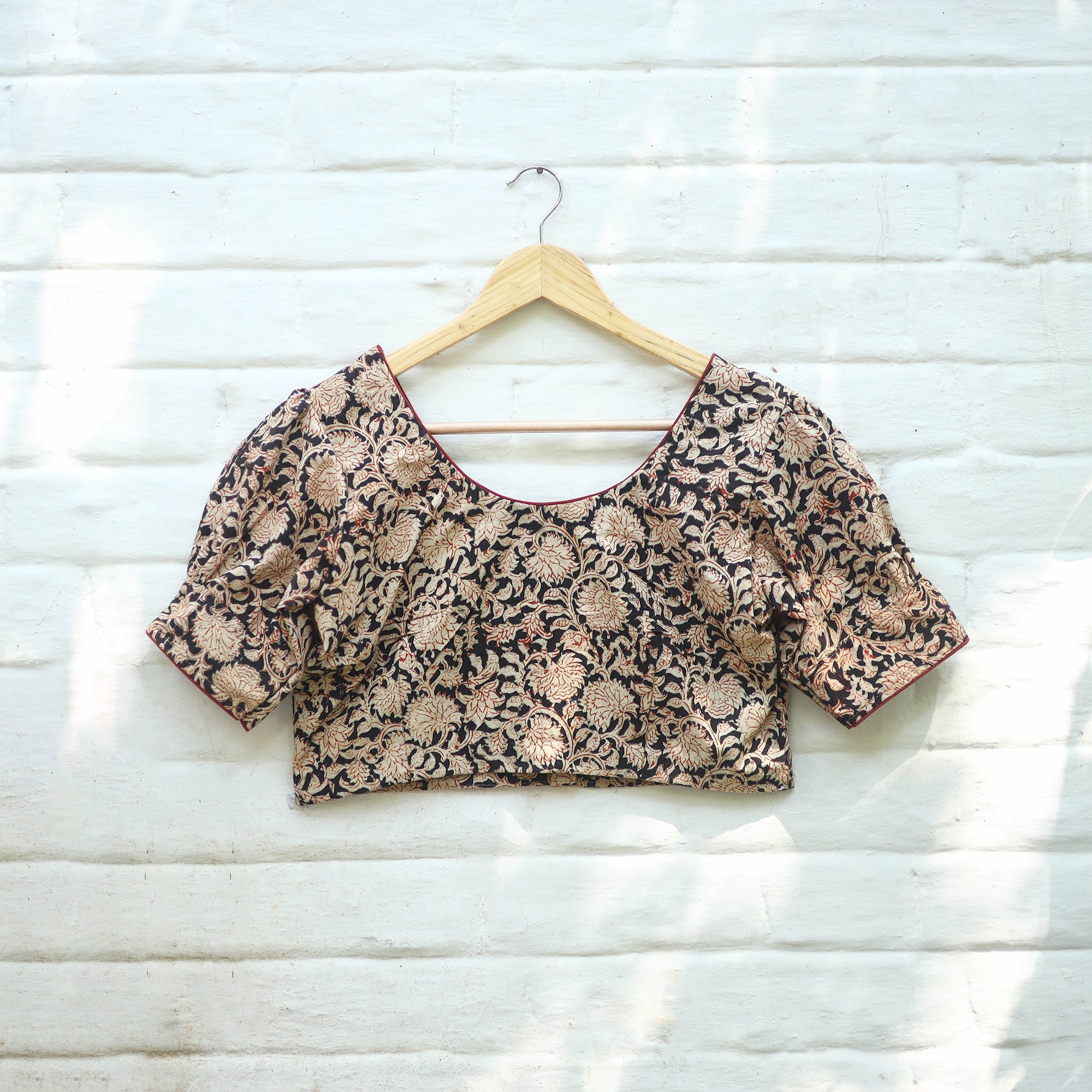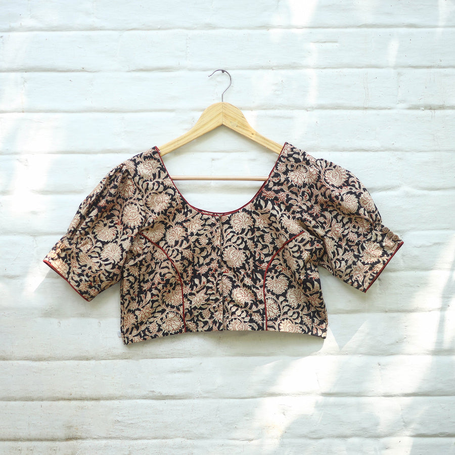 This stitched pedana kalamkari cotton blouse features traditional hand block printed motifs and is crafted using natural dyes. Designed with half sleeves and a secure hook closure, it offers breathability and comfort throughout the day. It's a versatile addition to any wardrobe, ideal for both casual and formal occasions.