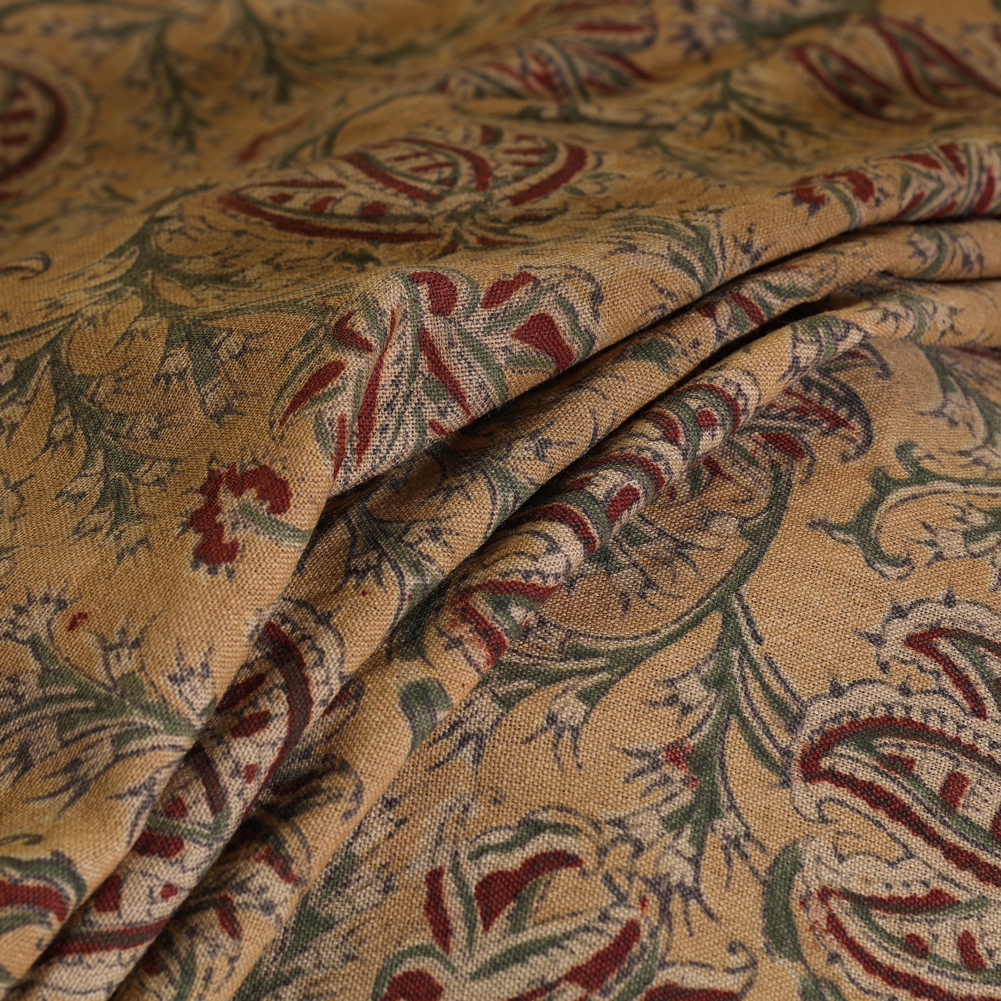 Experience the charm of Indian block printing with this beautifully crafted yellow pedana kalamkari fabric made from handwoven merino wool. Adorned with traditional motifs and dyed using natural colors by Pedana’s master artisans, it reflects both beauty and sustainability. Perfect for creating distinctive winter wear such as shawls and kurtas.
