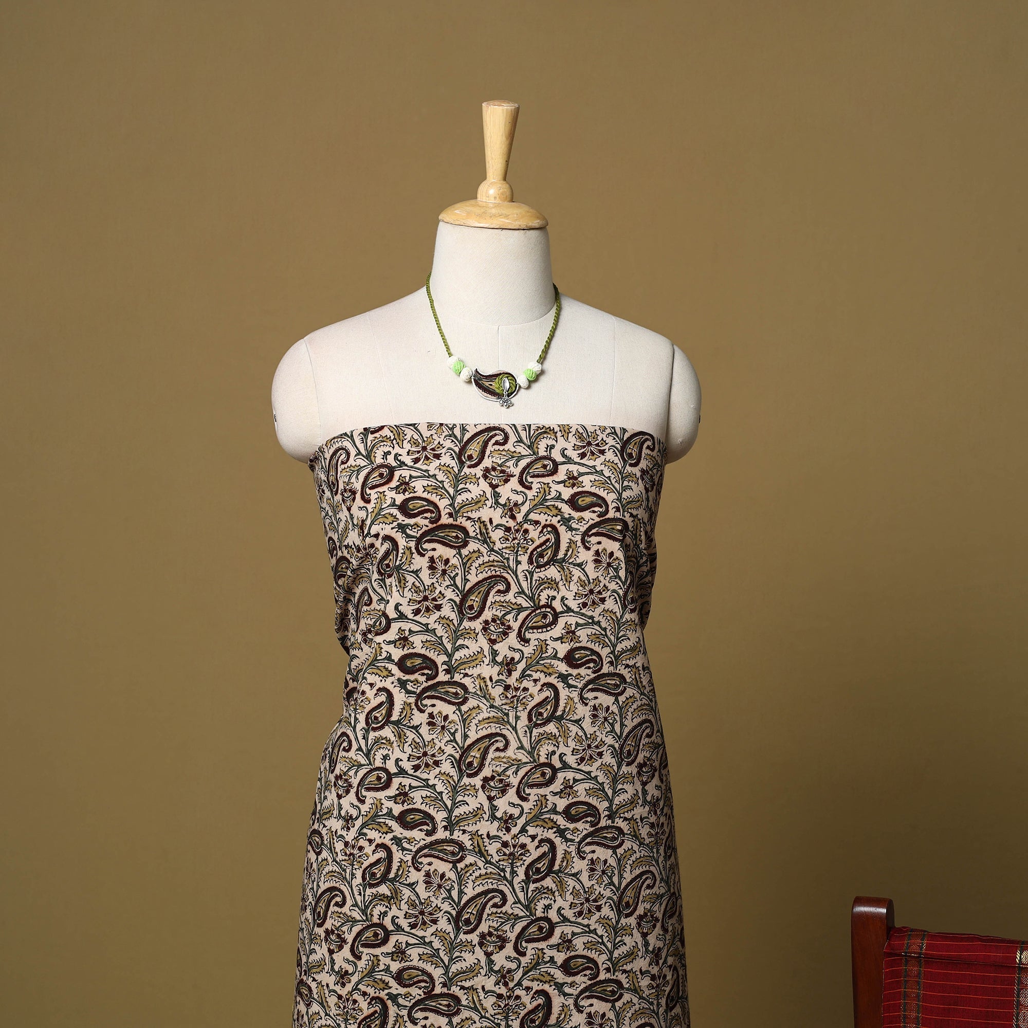 Beige 2pc cotton unstitched dress material set features a kalamkari block-printed, natural-dyed kurta fabric made by artisans from Pedana, Andhra Pradesh, known for one of India’s oldest textile printing traditions. It is paired with a dharwad-woven border dupatta. The set also includes a handcrafted necklace and matching earrings, making it perfect for festive events, family gatherings, special occasions or even as a thoughtful gift.