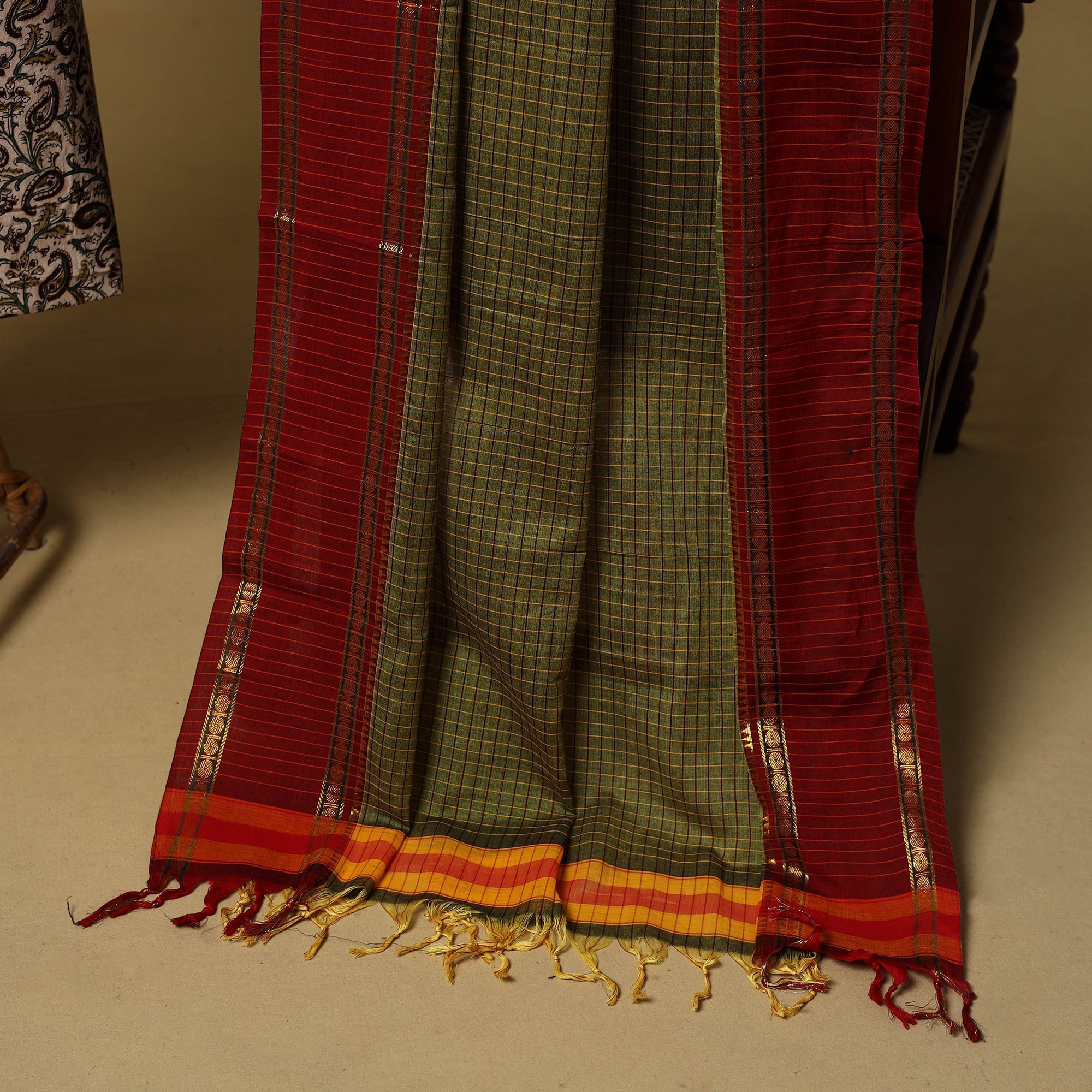 Kalamkari is a type of hand-painted or printed cotton fabric produced in Andhra Pradesh. This is a traditional printing method on cotton fabrics using natural materials without adding chemicals to cotton fabrics.