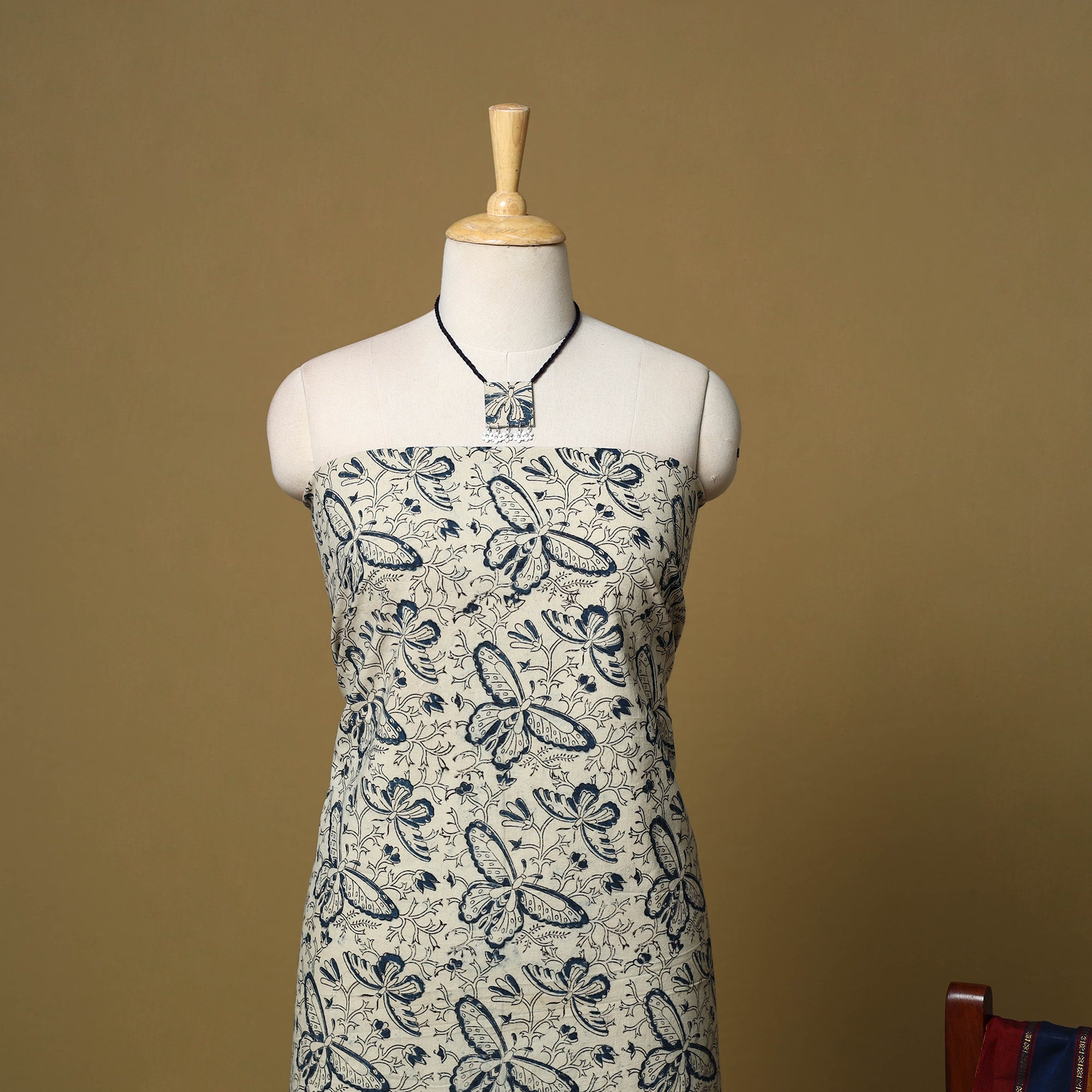 Beige 2pc cotton unstitched dress material set features a kalamkari block-printed, natural-dyed kurta fabric made by artisans from Pedana, Andhra Pradesh, known for one of India’s oldest textile printing traditions. It is paired with a dharwad-woven border dupatta. The set also includes a handcrafted necklace and matching earrings, making it perfect for festive events, family gatherings, special occasions or even as a thoughtful gift.