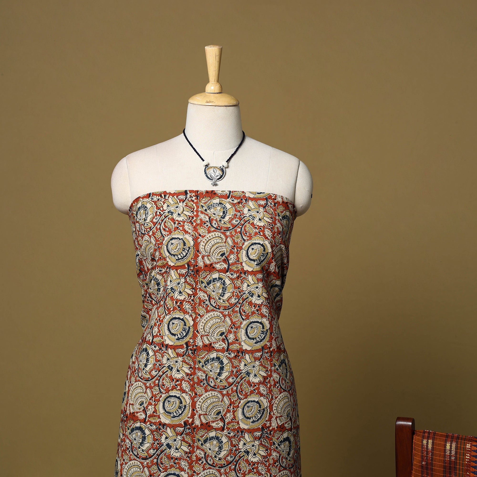 Red 2pc cotton unstitched dress material set features a kalamkari block-printed, natural-dyed kurta fabric made by artisans from Pedana, Andhra Pradesh, known for one of India’s oldest textile printing traditions. It is paired with a dharwad-woven border dupatta. The set also includes a handcrafted necklace and matching earrings, making it perfect for festive events, family gatherings, special occasions or even as a thoughtful gift.