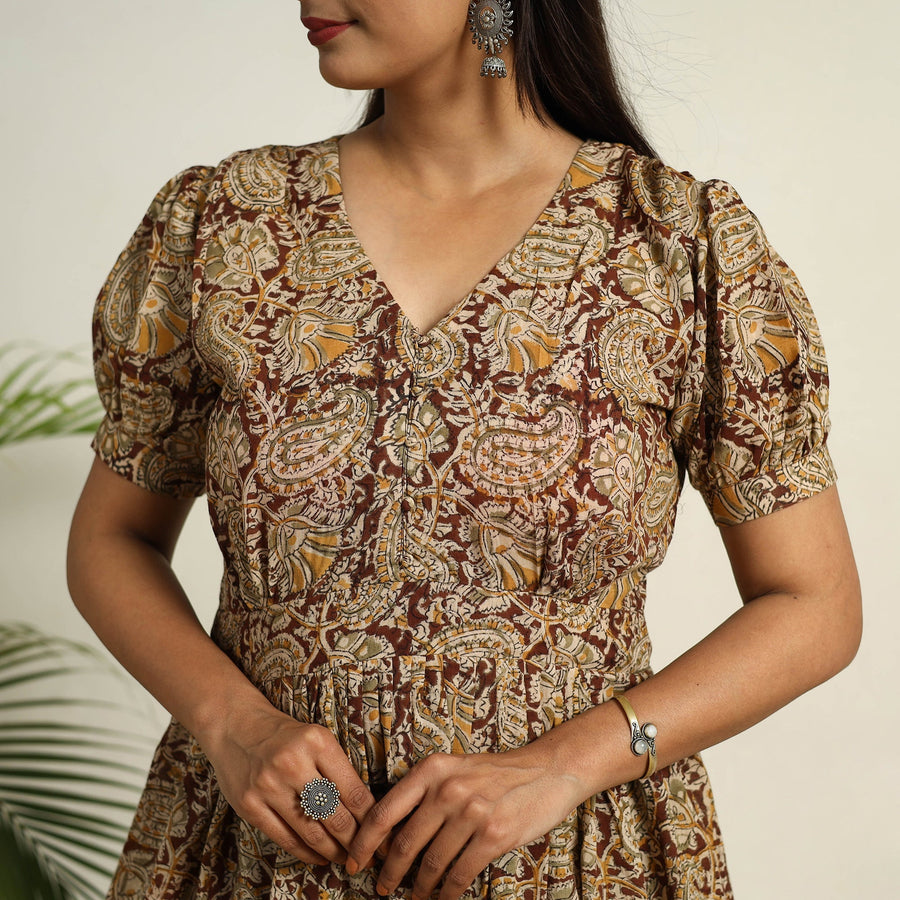 Embrace the timeless beauty of this Pedana block print mul cotton flared brown kalamkari dress, crafted to add elegance to your wardrobe. The lightweight, naturally dyed fabric provides exceptional comfort, while its flowy silhouette offers a graceful fit. Ideal for casual outings or festive gatherings, this dress is a blend of tradition and effortless charm.