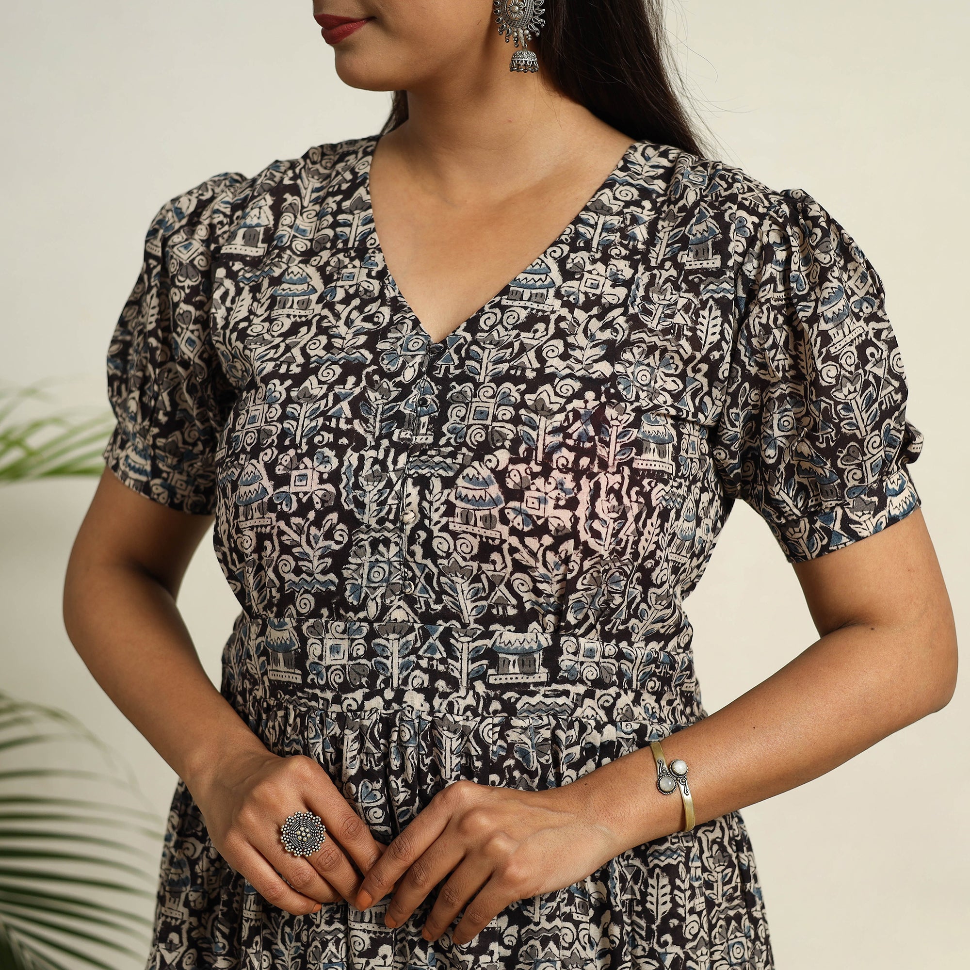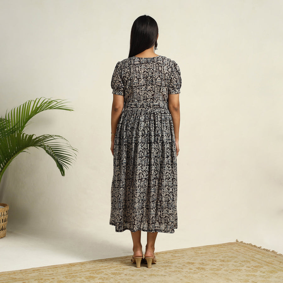 Embrace the timeless beauty of this Pedana block print mul cotton black flared kalamkari dress, crafted to add elegance to your wardrobe. The lightweight, naturally dyed fabric provides exceptional comfort, while its flowy silhouette offers a graceful fit. Ideal for casual outings or festive gatherings, this dress is a blend of tradition and effortless charm.