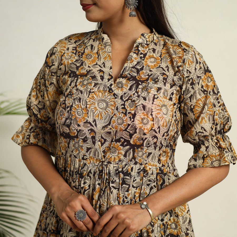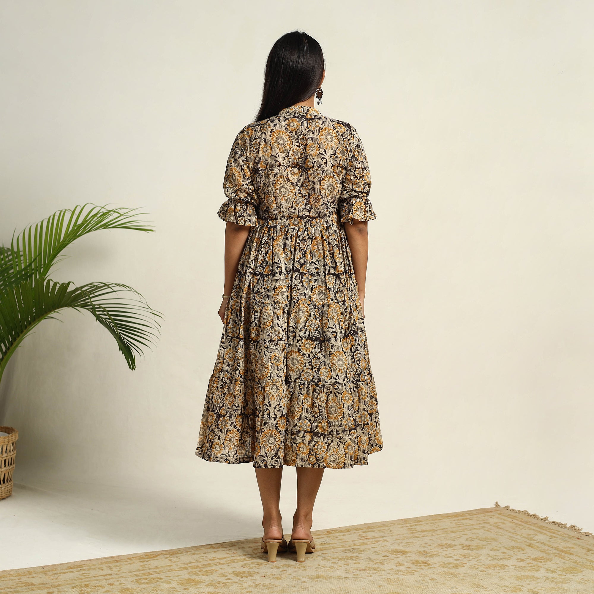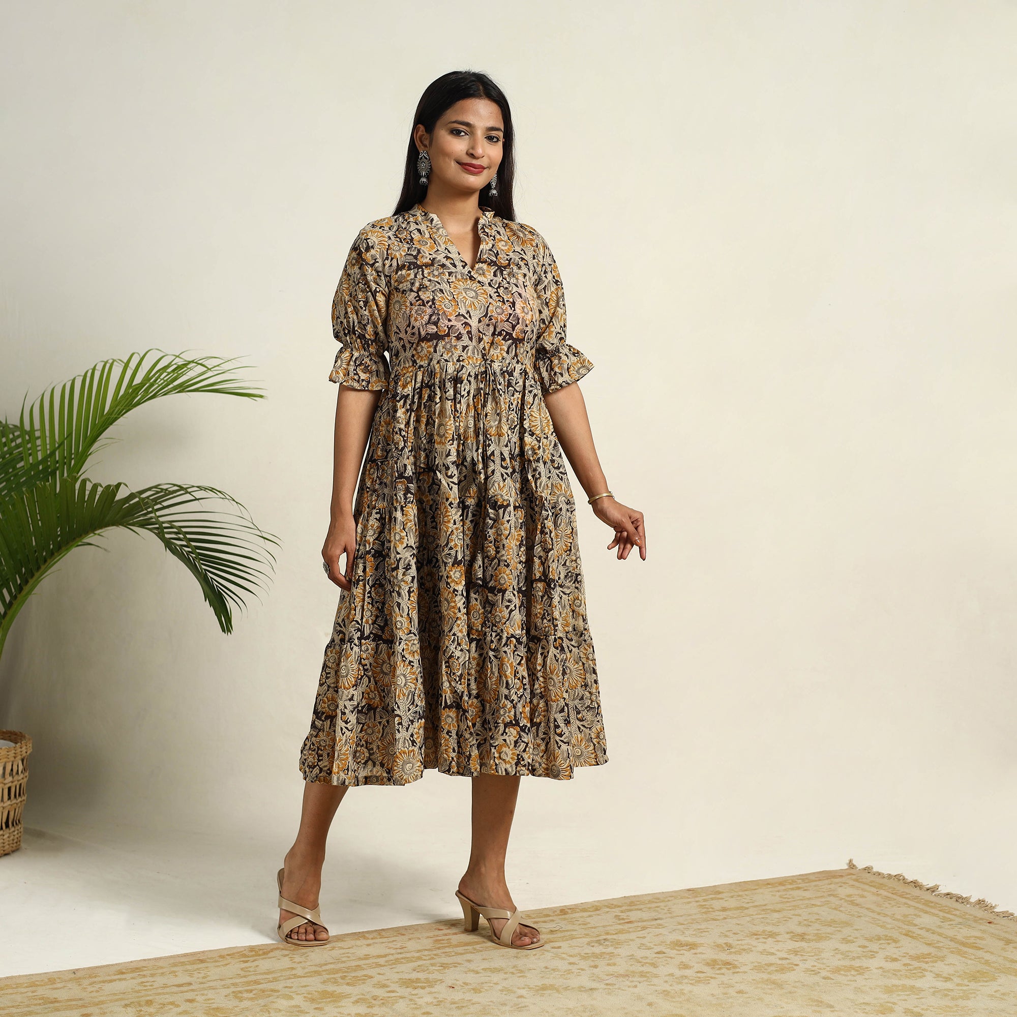 Indulge in the traditional charm of this beige Pedana block print mul cotton tiered kalamkari dress, thoughtfully designed to elevate your style. Made from naturally dyed fabric, it offers a soft and comfortable feel against your skin. The unique tiered design provides a flattering fit, making it perfect for both daily outings and special occasions.