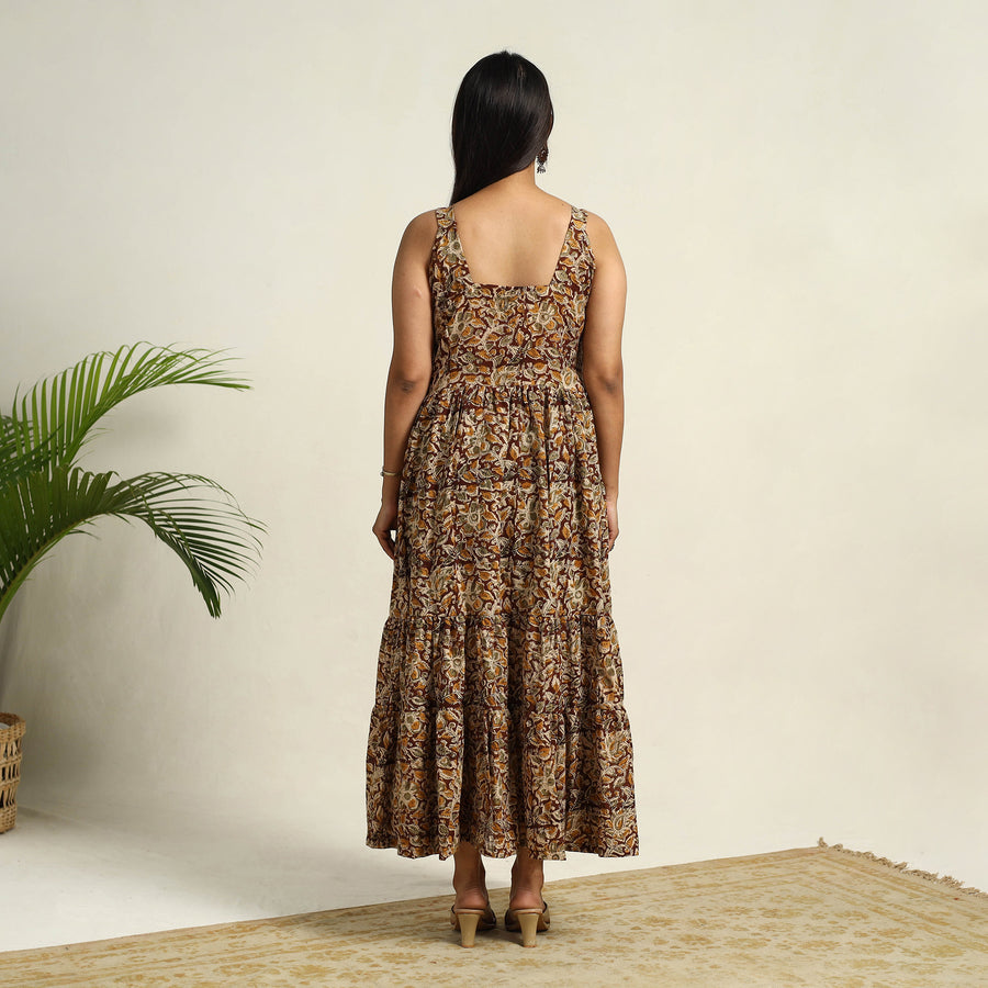 Embrace the elegance of heritage craftsmanship with this brown Pedana block print mul cotton sleeveless dress. Designed with a tiered silhouette and adorned with Kalamkari artistry, this piece offers effortless grace and all-day comfort. Its naturally dyed cotton fabric ensures breathability, making it an ideal pick for everyday wear or festive gatherings.
