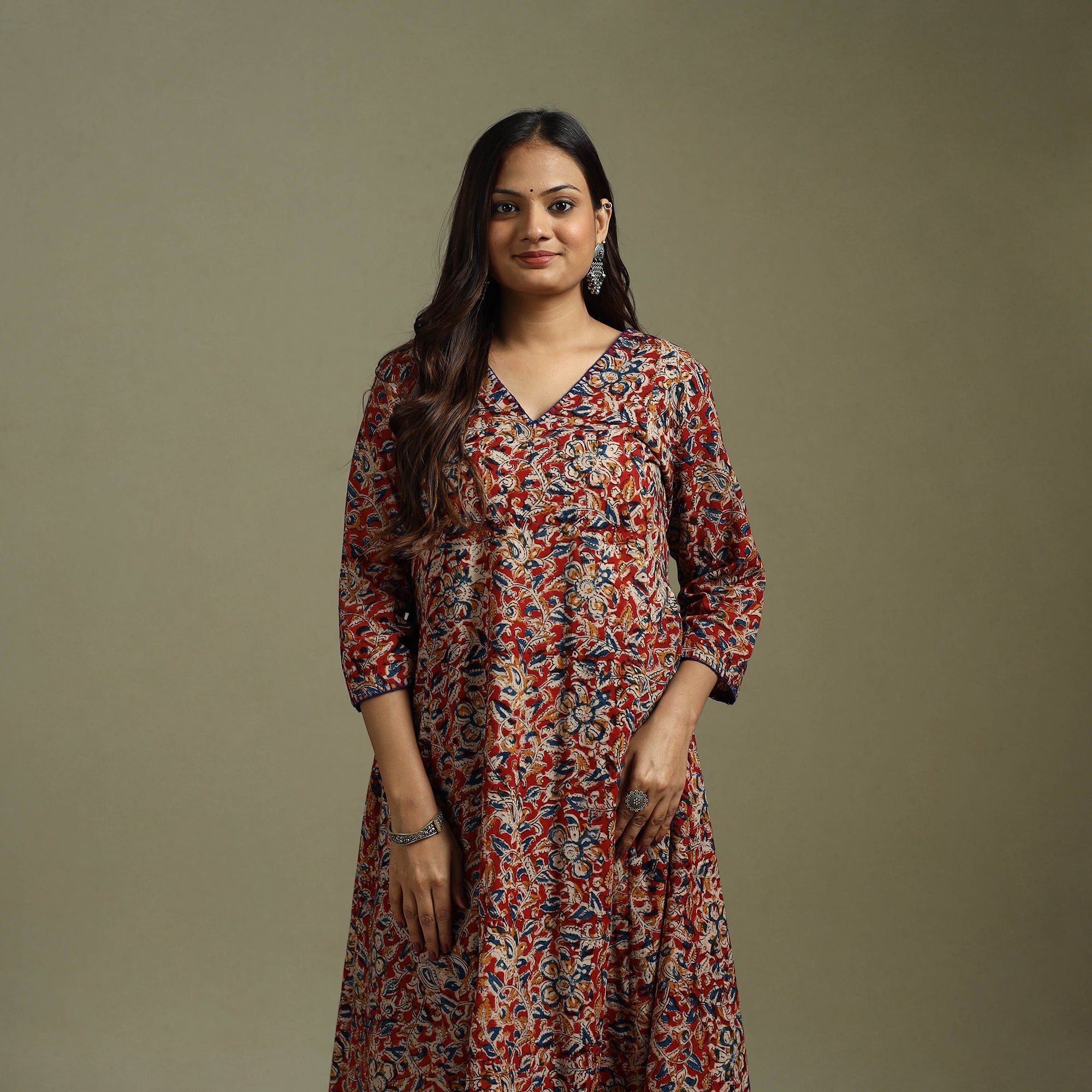 Red pure cotton hand embroidery A-Line kurta features Pedana kalamkari block printing, created using wooden blocks and natural dyes. The motifs reflect generations of artistry. Designed in a relaxed fit with a functional side pocket it is perfect for everyday wear or occasional outings.