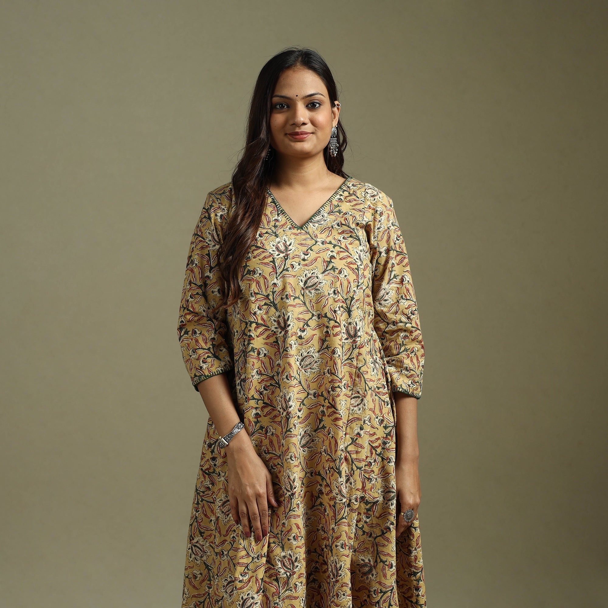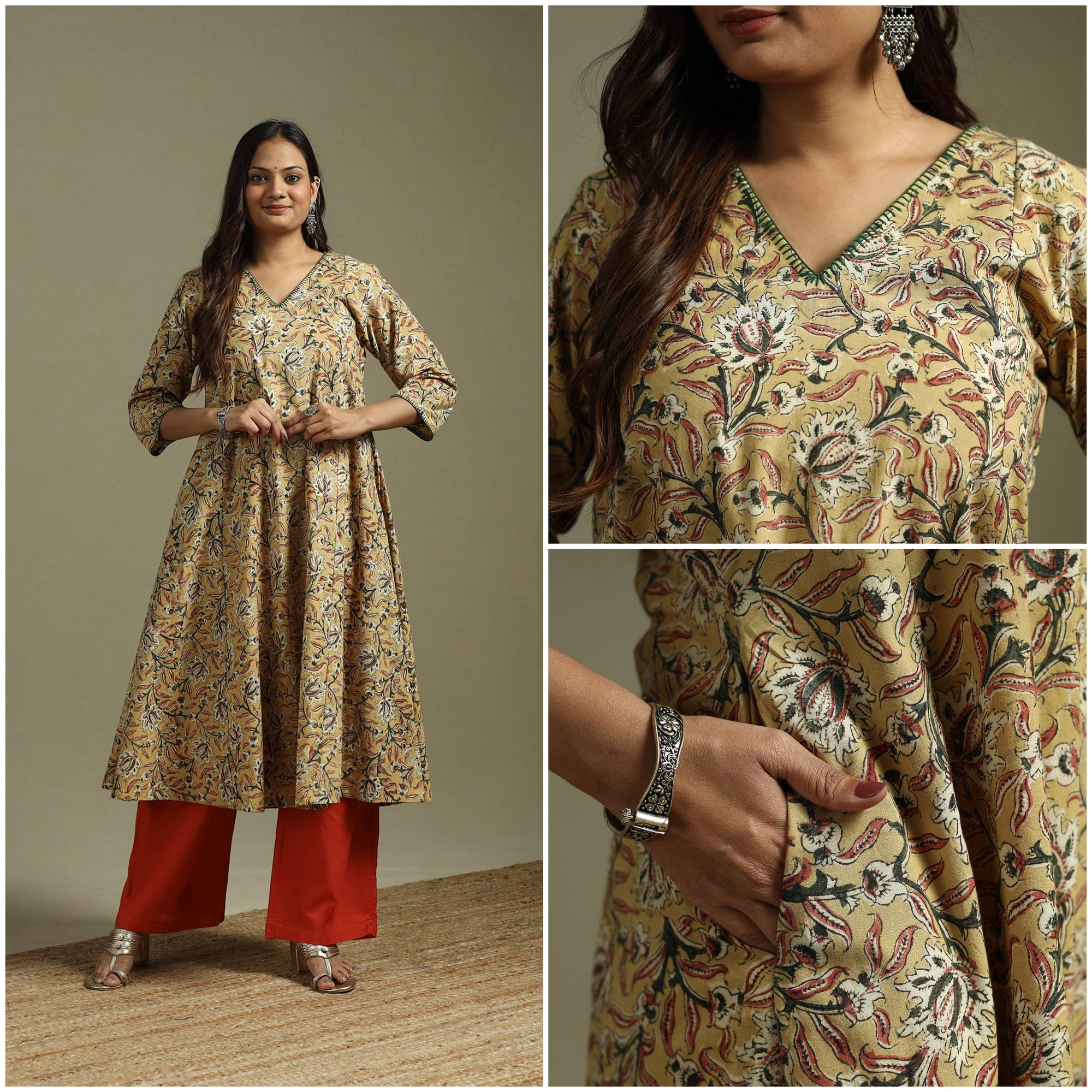 Yellow pure cotton hand embroidery A-Line kurta features Pedana kalamkari block printing, created using wooden blocks and natural dyes. The motifs reflect generations of artistry. Designed in a relaxed fit with a functional side pocket it is perfect for everyday wear or occasional outings.