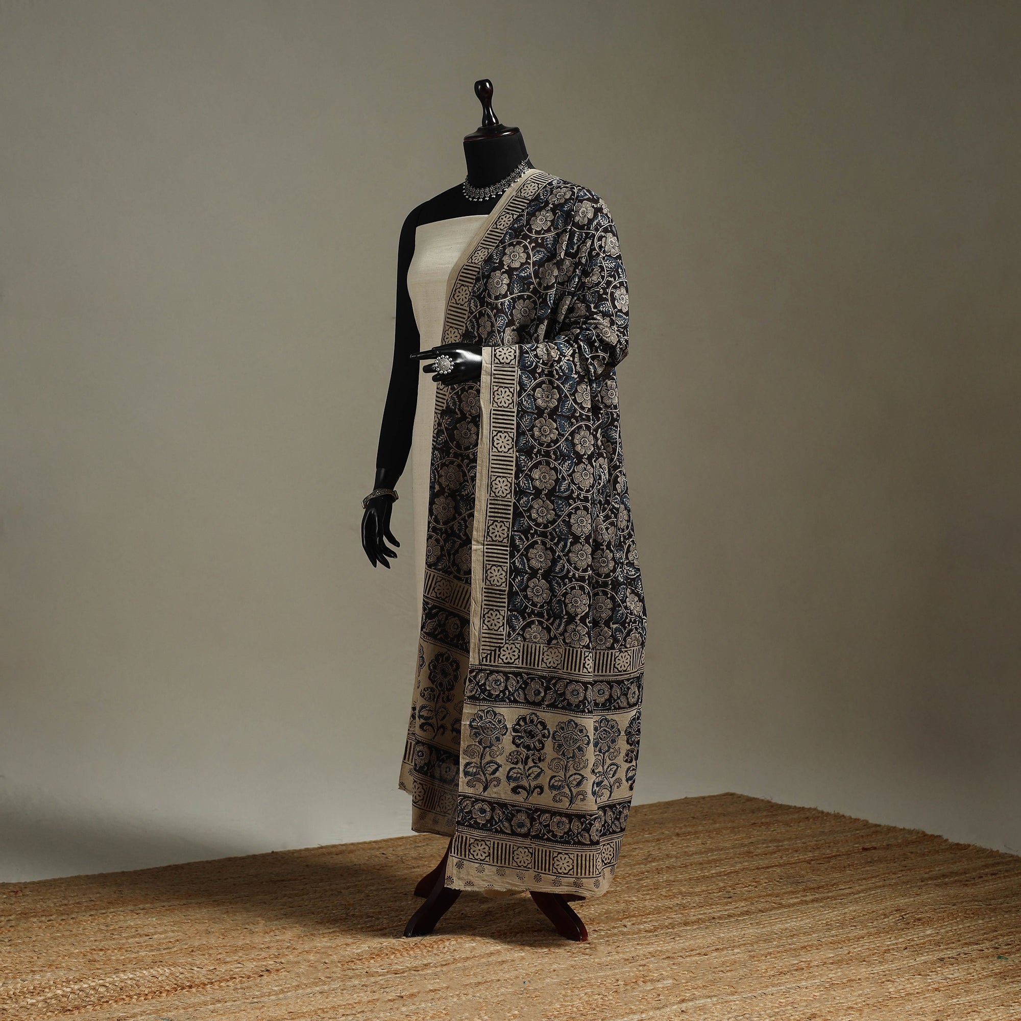 Experience the elegance of this black kalamkari cotton dupatta, crafted by skilled Pedana artisans. Showcasing detailed motifs inspired by nature and mythology, it is block-printed and dyed with natural colors using age-old techniques. The soft, breathable cotton drapes beautifully, making it an ideal match for both ethnic and modern outfits.