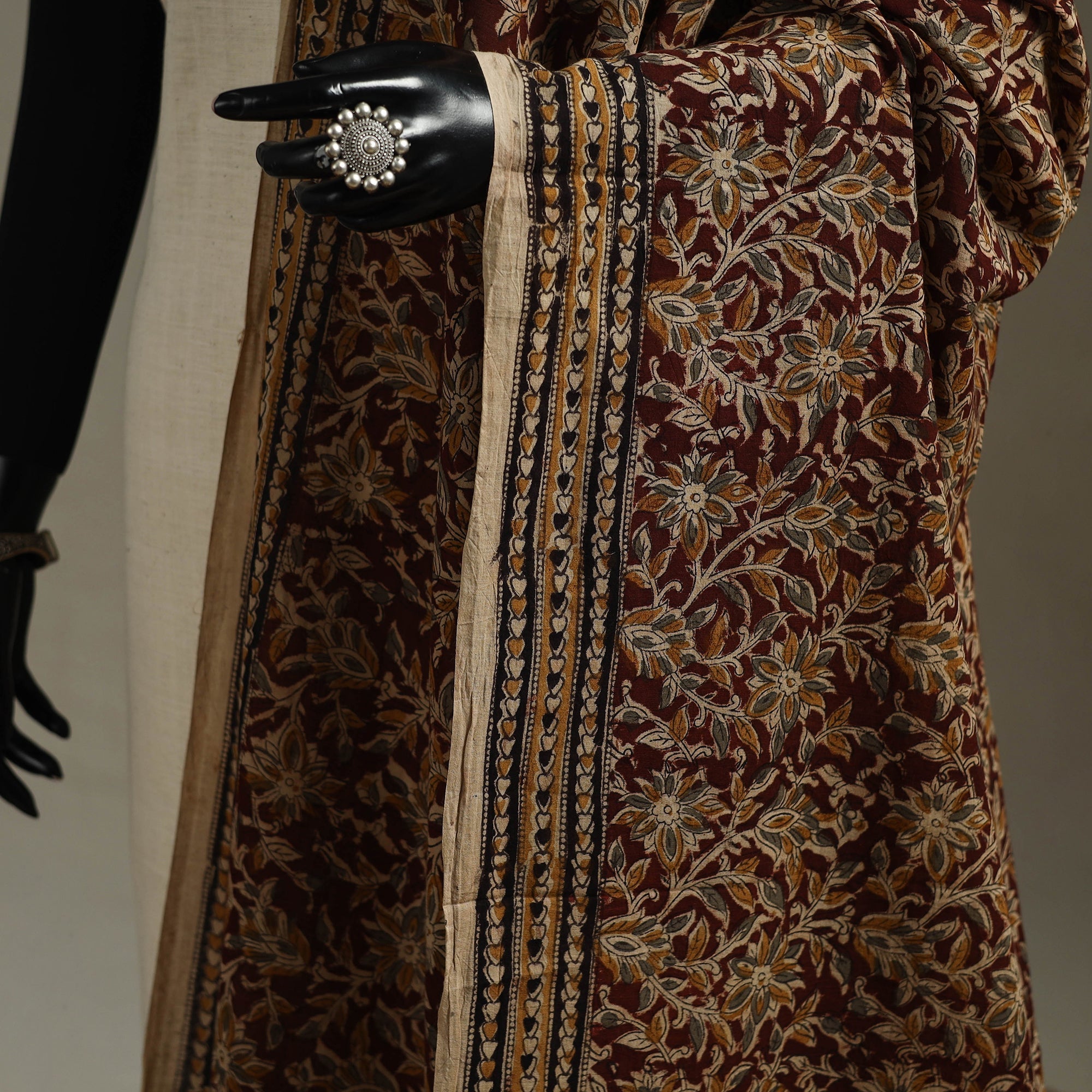 Experience the elegance of this maroon kalamkari cotton dupatta, crafted by skilled Pedana artisans. Showcasing detailed motifs inspired by nature and mythology, it is block-printed and dyed with natural colors using age-old techniques. The soft, breathable cotton drapes beautifully, making it an ideal match for both ethnic and modern outfits.