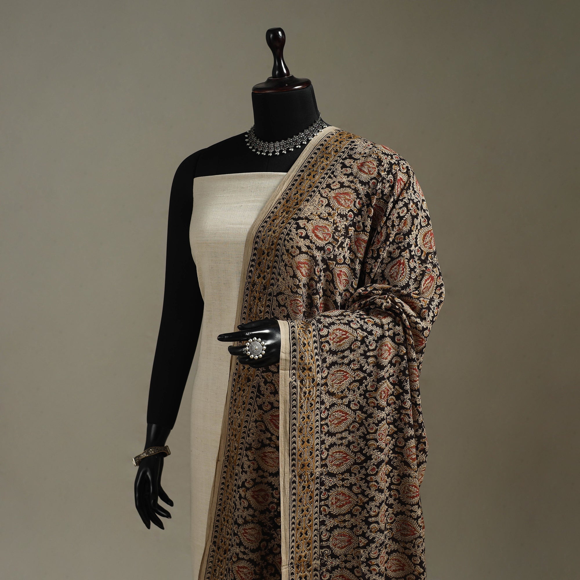 Experience the elegance of this black kalamkari cotton dupatta, crafted by skilled Pedana artisans. Showcasing detailed motifs inspired by nature and mythology, it is block-printed and dyed with natural colors using age-old techniques. The soft, breathable cotton drapes beautifully, making it an ideal match for both ethnic and modern outfits.