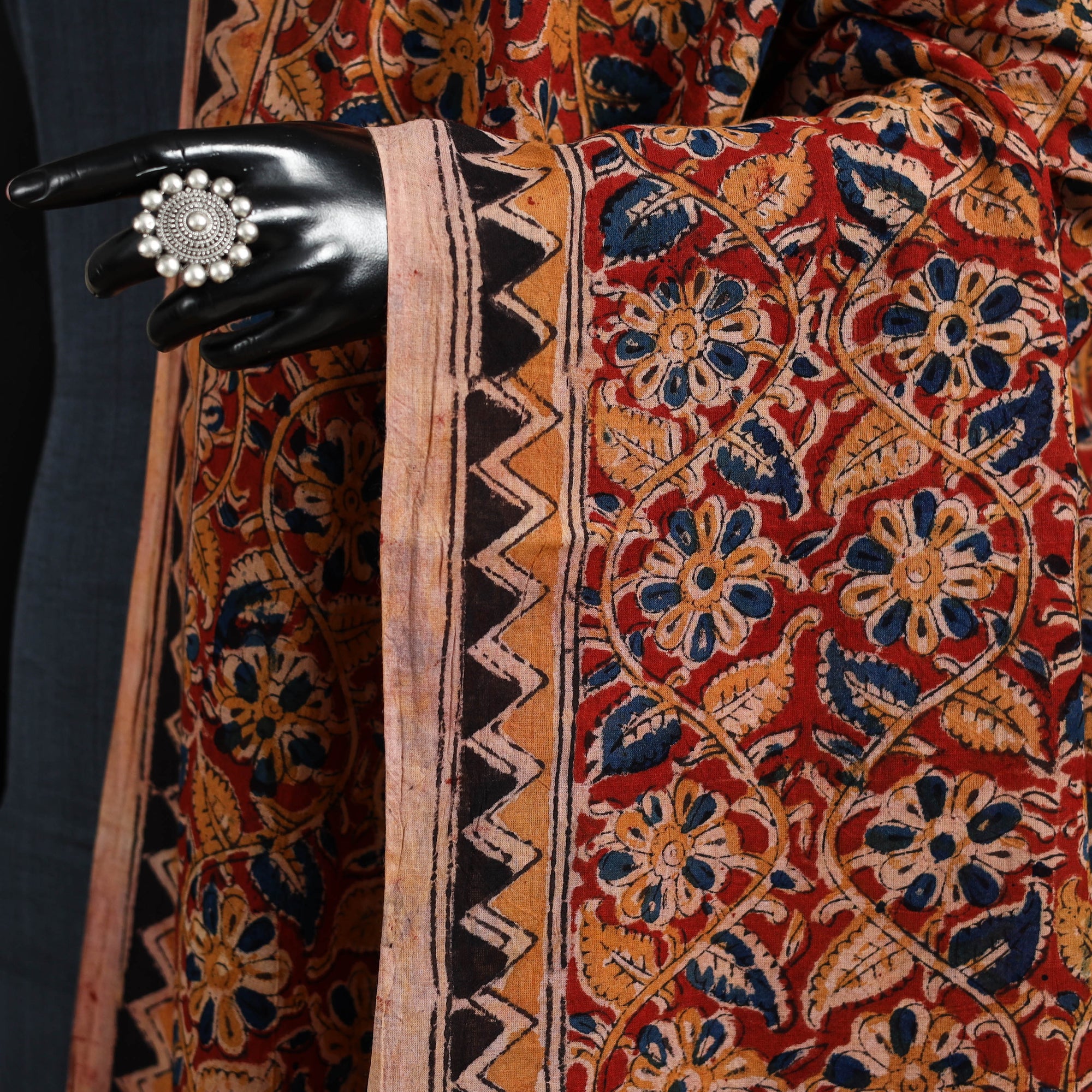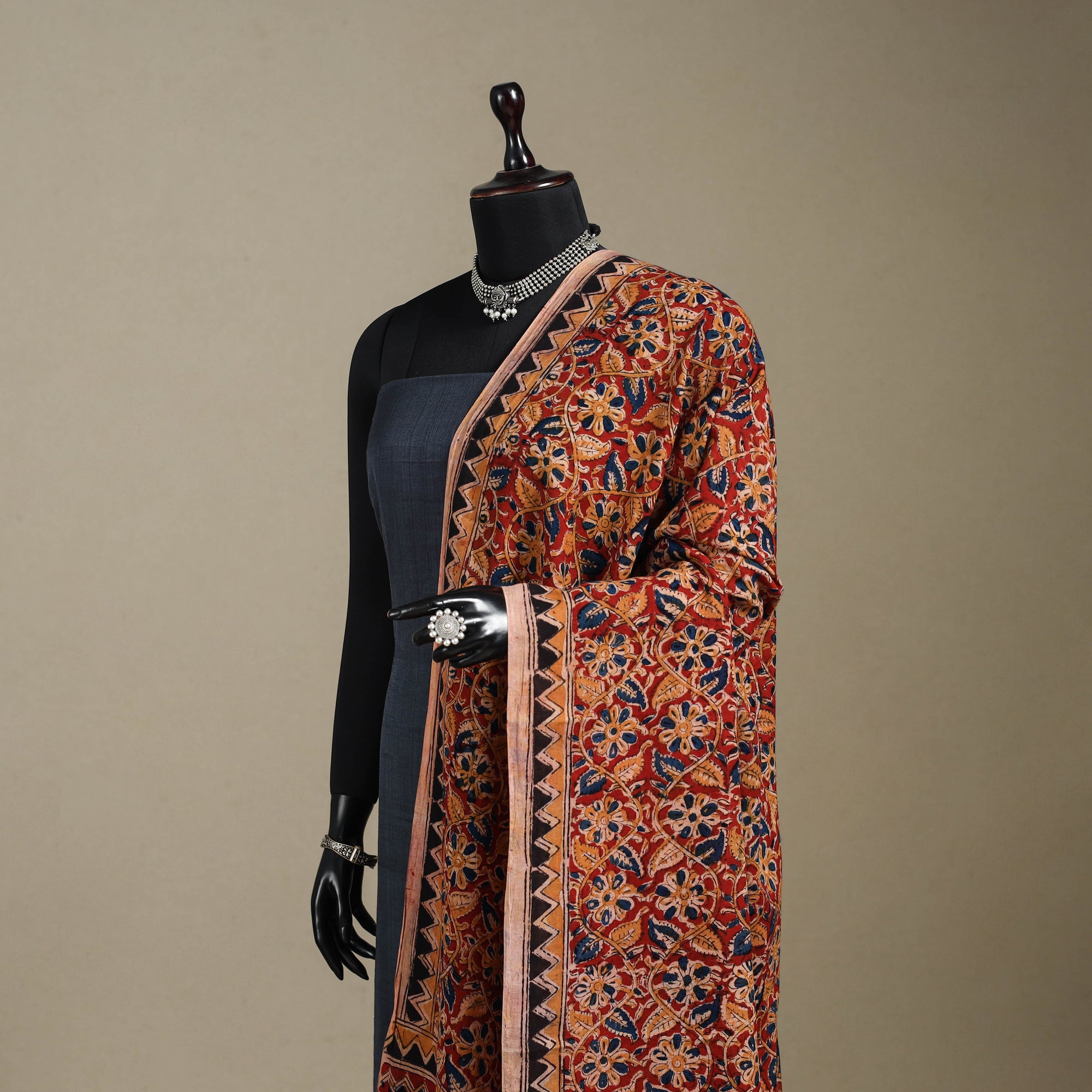Experience the elegance of this red kalamkari cotton dupatta, crafted by skilled Pedana artisans. Showcasing detailed motifs inspired by nature and mythology, it is block-printed and dyed with natural colors using age-old techniques. The soft, breathable cotton drapes beautifully, making it an ideal match for both ethnic and modern outfits.