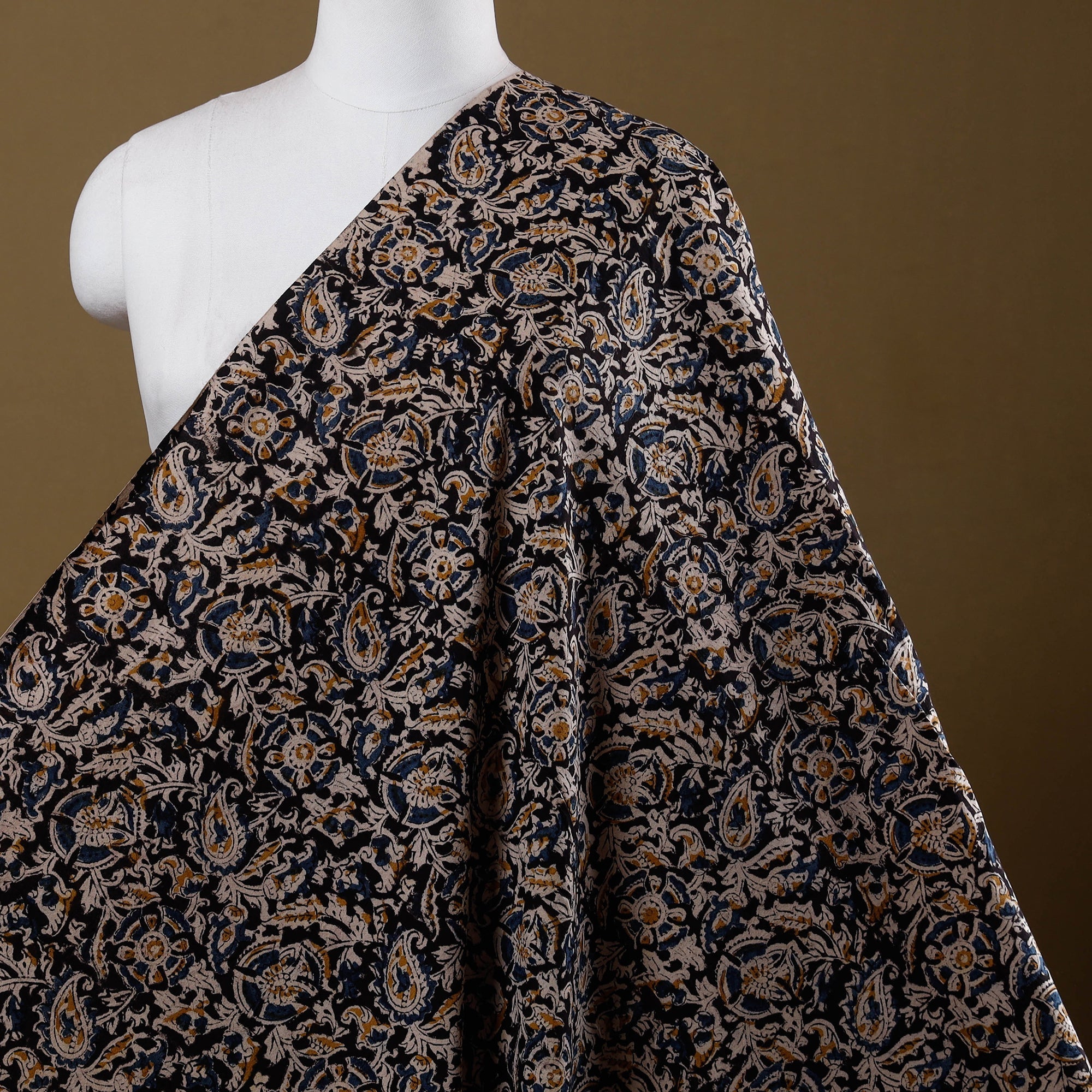 Kalamkari block-printed pure cotton fabric is created using one of the earliest and most intricate printing techniques. Skilled artisans use hand-carved wooden blocks dipped in natural dyes to form detailed Kalamkari motifs. Made in Pedana, Andhra Pradesh, this fabric is suitable for stitching garments, dupattas or home decor accents.