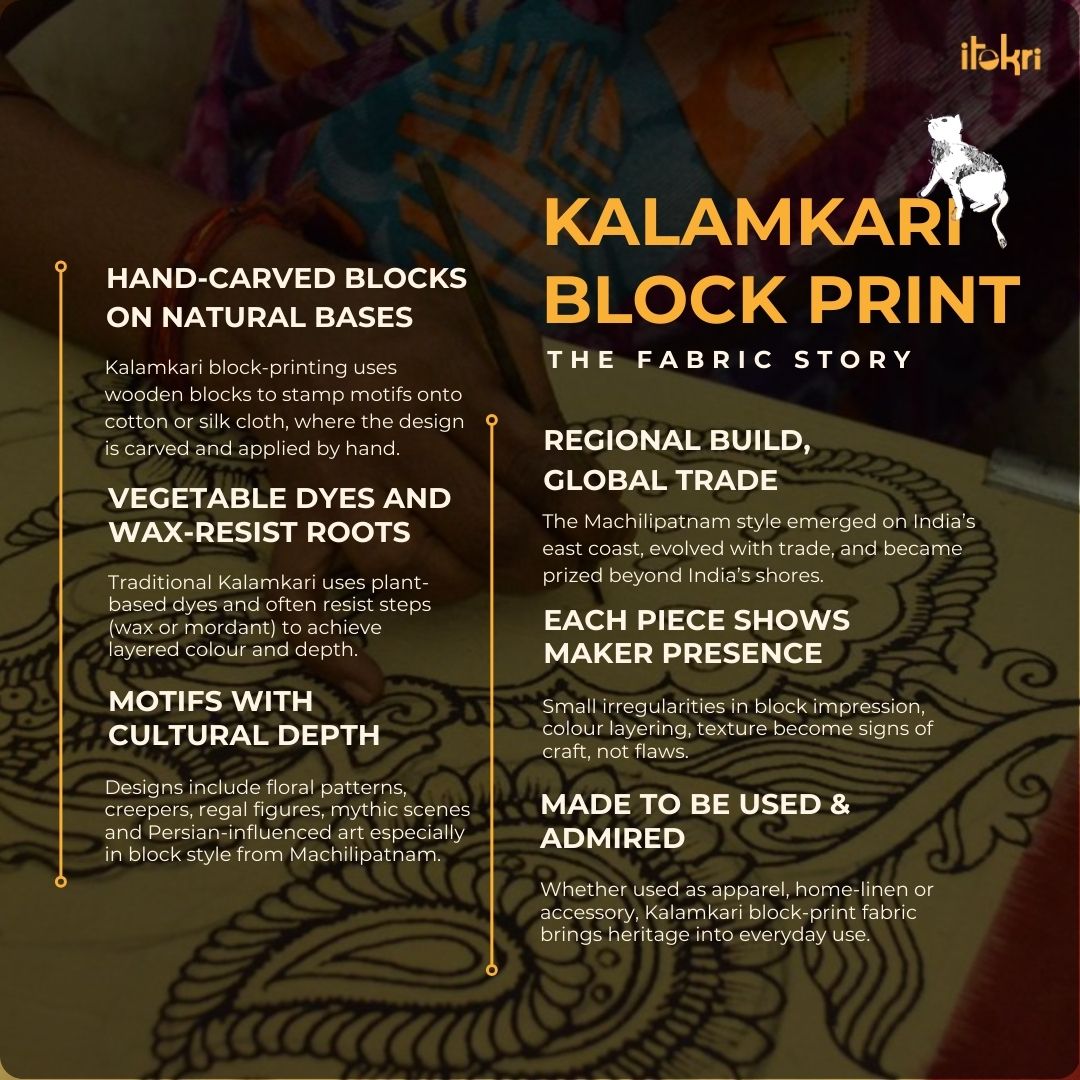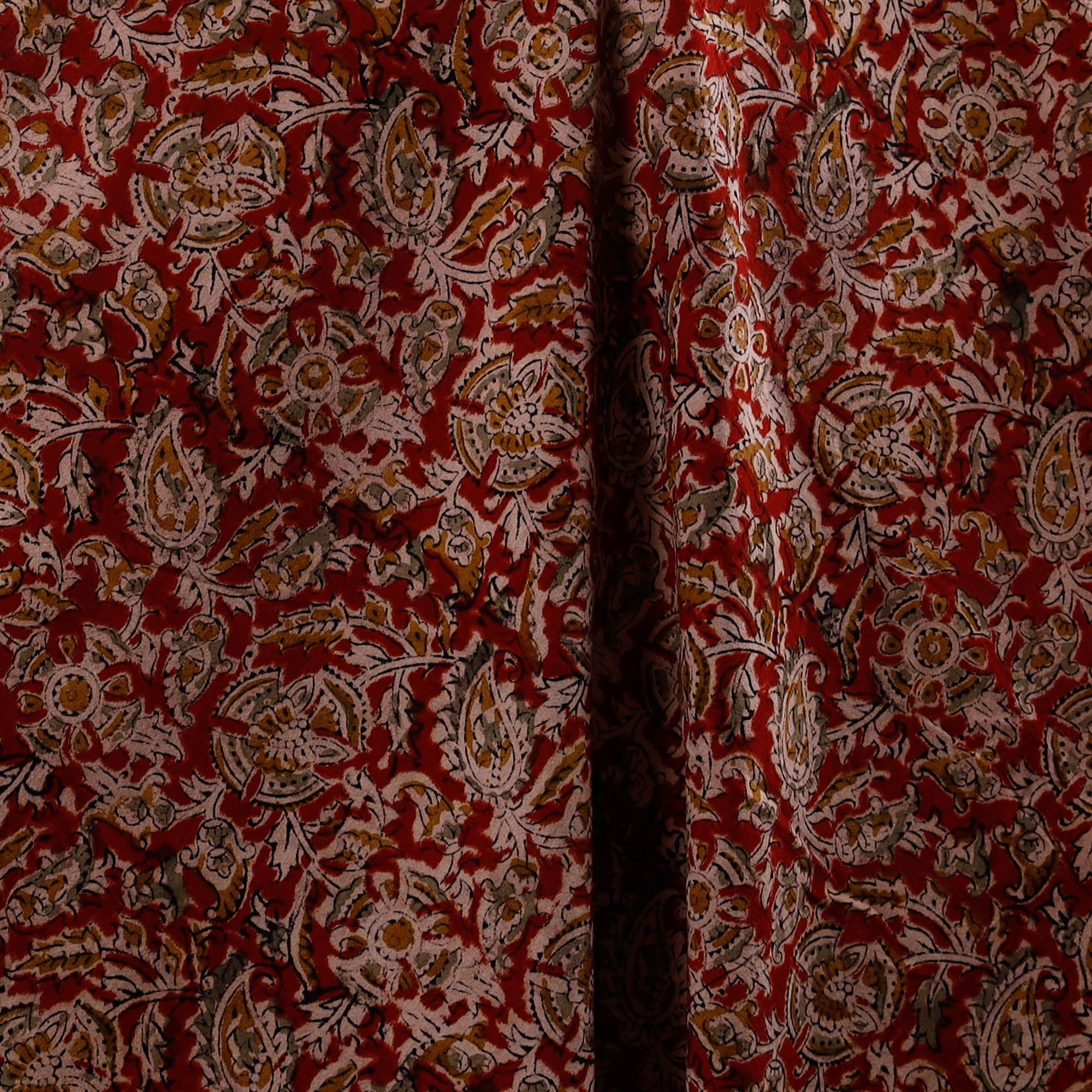 Kalamkari block-printed pure cotton fabric is created using one of the earliest and most intricate printing techniques. Skilled artisans use hand-carved wooden blocks dipped in natural dyes to form detailed Kalamkari motifs. Made in Pedana, Andhra Pradesh, this fabric is suitable for stitching garments, dupattas or home decor accents.