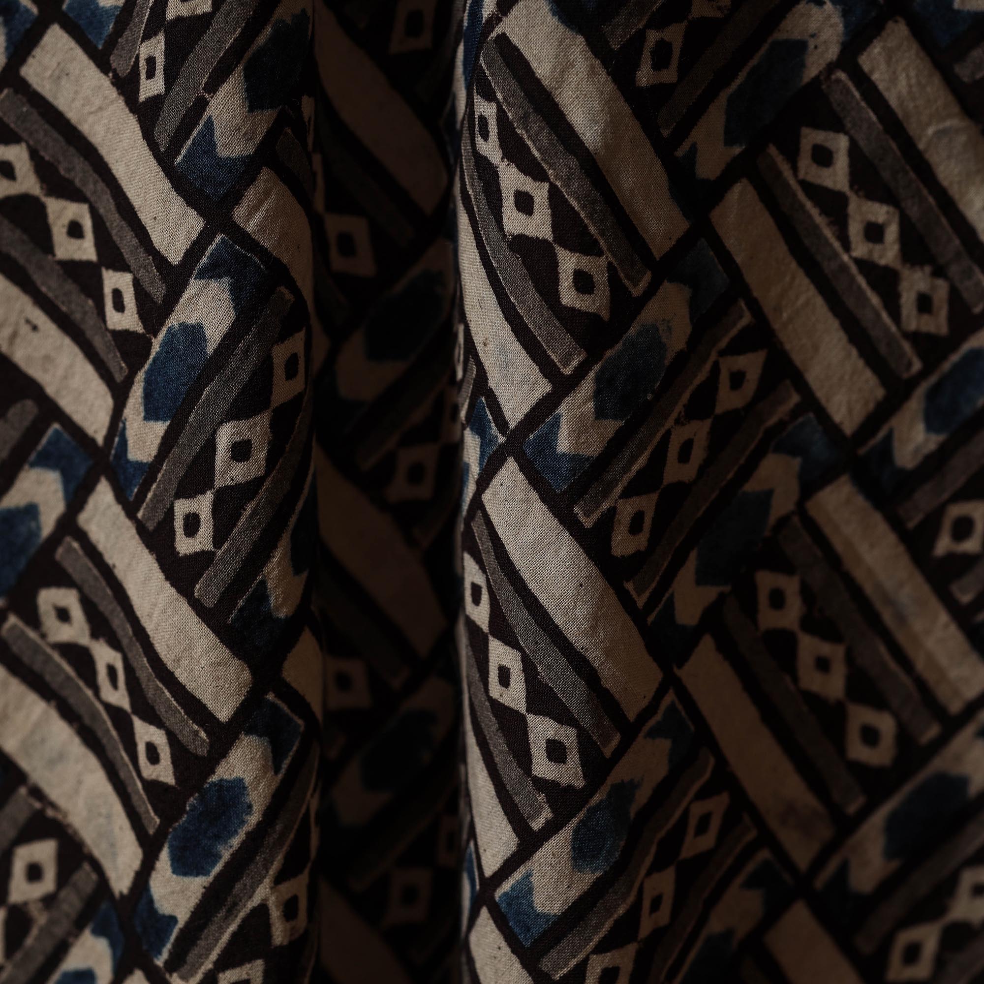 Black kalamkari block-printed pure cotton fabric is created using one of the earliest and most intricate printing techniques. Skilled artisans use hand-carved wooden blocks dipped in natural dyes to form detailed kalamkari motifs. Made in Pedana, Andhra Pradesh, this fabric is suitable for stitching garments, dupattas or home decor accents.
