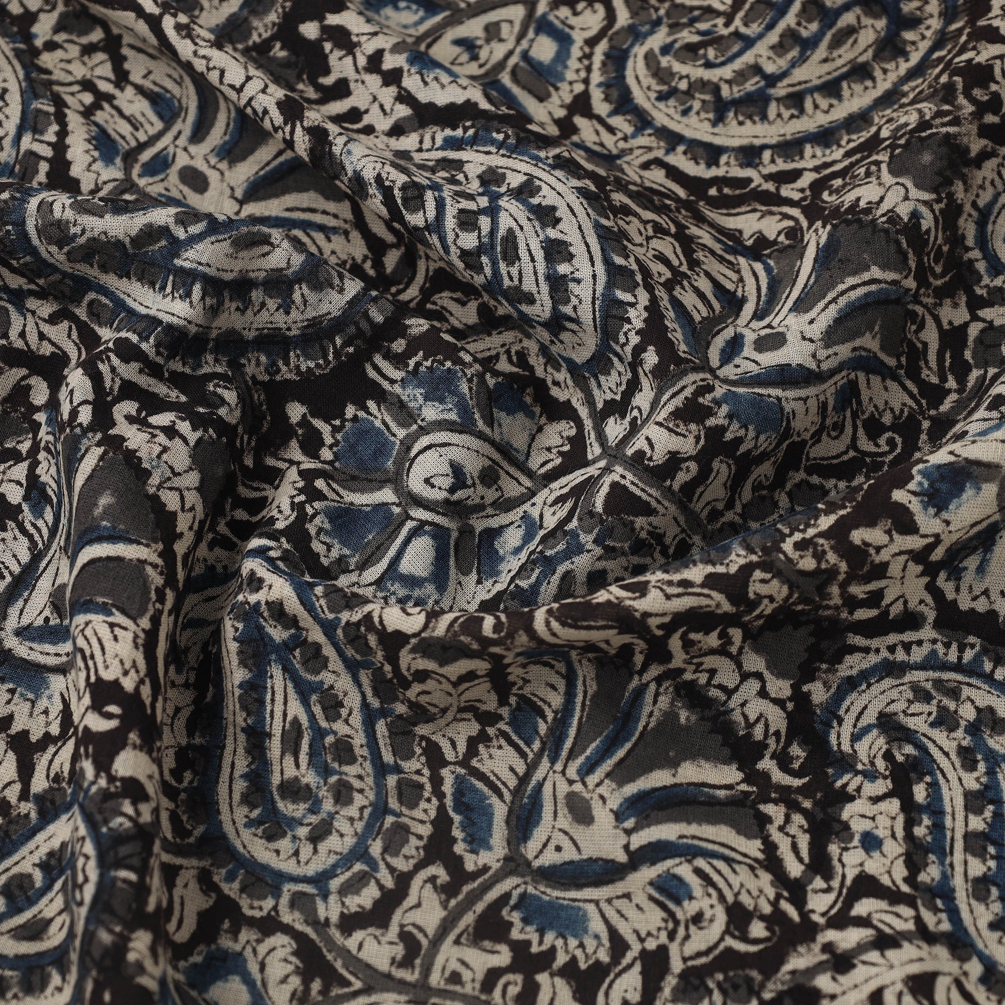 This black hand block print mul cotton kalamkari fabric is crafted by artisans in Pedana, Andhra Pradesh. Using natural dyes and traditional block printing, it features intricate motifs inspired by classic kalamkari art. Soft, eco-friendly, this fabric is perfect for sustainable projects, timeless outfits, and stylish home décor.