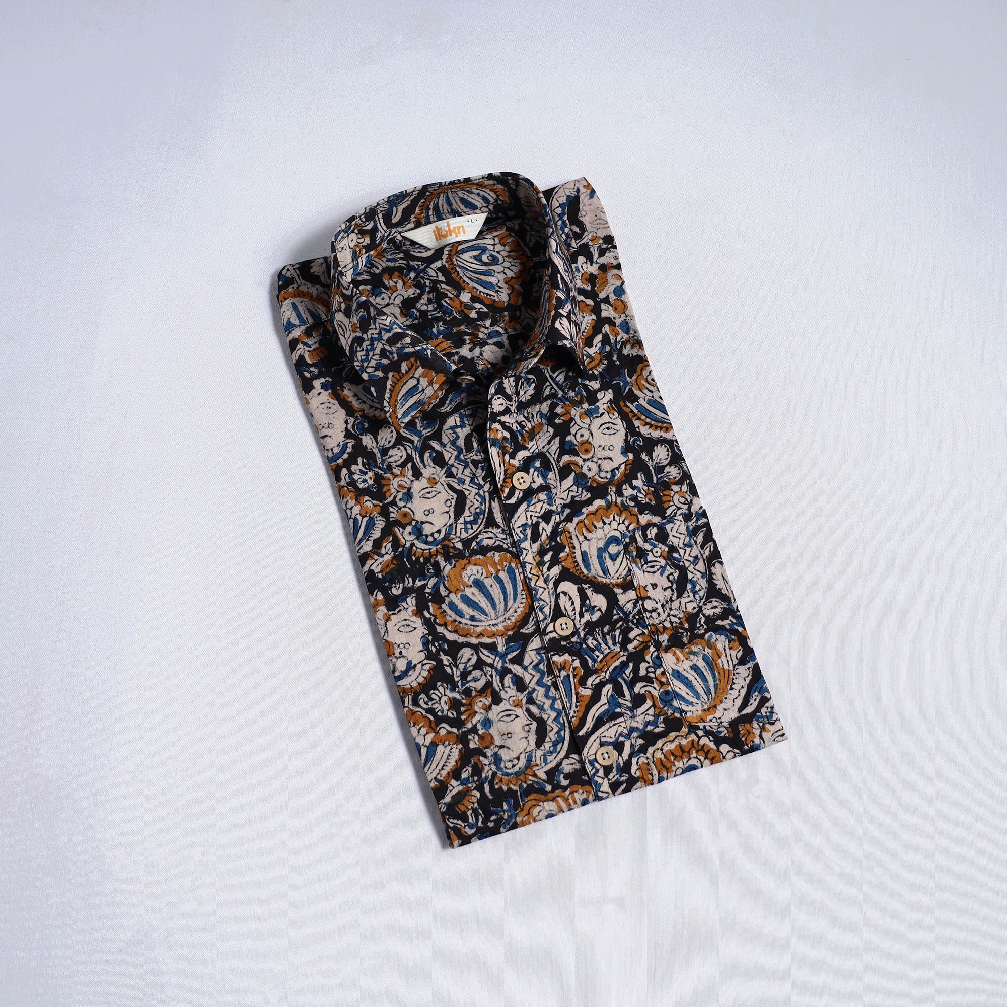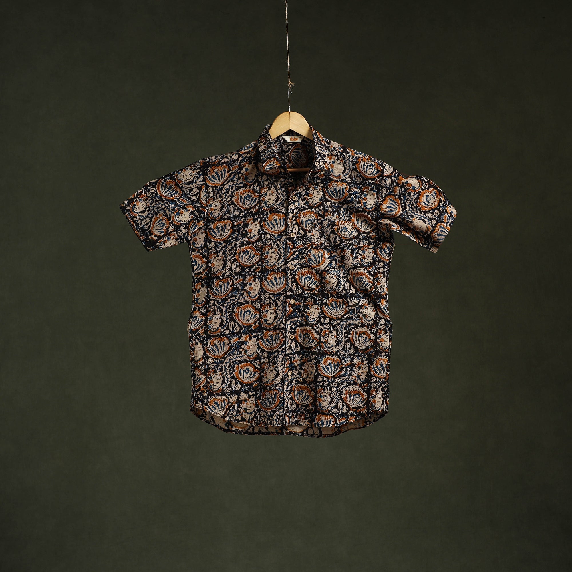 | Material | Pedana kalamkari hand block print pure cotton shirt is crafted using one of the oldest and most intricate printing techniques in Andhra Pradesh, dating back over 3,000 years. Skilled artisans use hand-carved wooden blocks dipped in natural dyes to create detailed kalamkari motifs inspired by mythology, nature and traditional patterns. The shirt features a regular collar and half sleeves, while wooden buttons add a touch of natural charm. A patch pocket on the front offers added convenience. It is suitable for daily outings, casual meet-ups and relaxed occasions. A Note on Handmade Beauty: |