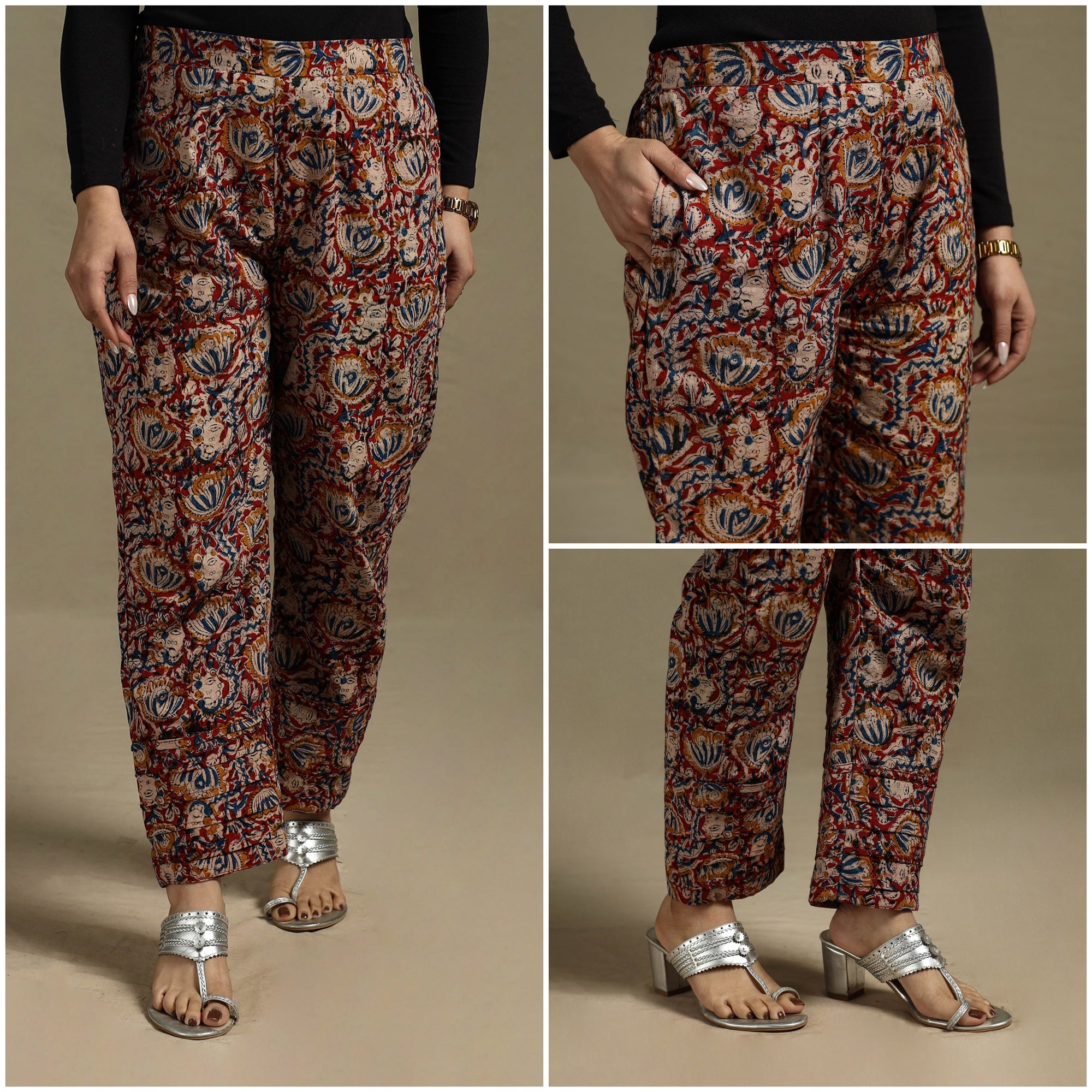 | Material | The kalamkari women's pant is crafted using traditional hand block printing and natural dyeing techniques from Pedana, Andhra Pradesh. Made from pure cotton, the elasticated waist and two side pockets ensure all-day comfort and ease. Complete the look by pairing it with your favourite kurta. A Note on Handmade Beauty : |