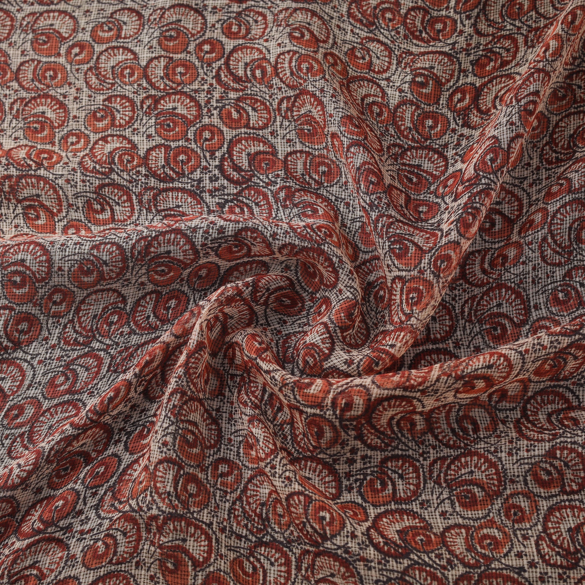 Orange kalamkari hand block print kota doria cotton fabric from Pedana, Andhra Pradesh, is created using one of the earliest and most intricate printing techniques. Kalamkari is an ancient art form believed to be around 3,000 years old. Crafted by Skilled artisan Pitchuka Srinivas, who uses hand-carved wooden blocks dipped in natural dyes to create traditional kalamkari pattern, he has dedicated his life to preserving the heritage of hand block printed Pedana kalamkari, keeping this centuries-old craft alive through original techniques and natural dye processes. Kota doria is an age-old Indian textile produced in the Kota district of Rajasthan. The doria or the threads are finely interweaves to make the check patterns. Its lightweight and sheer texture giving an exquisite grace and elegance of its own. This fabric is suitable for sarees, suits, dupattas, kurtas, dresses & stoles.