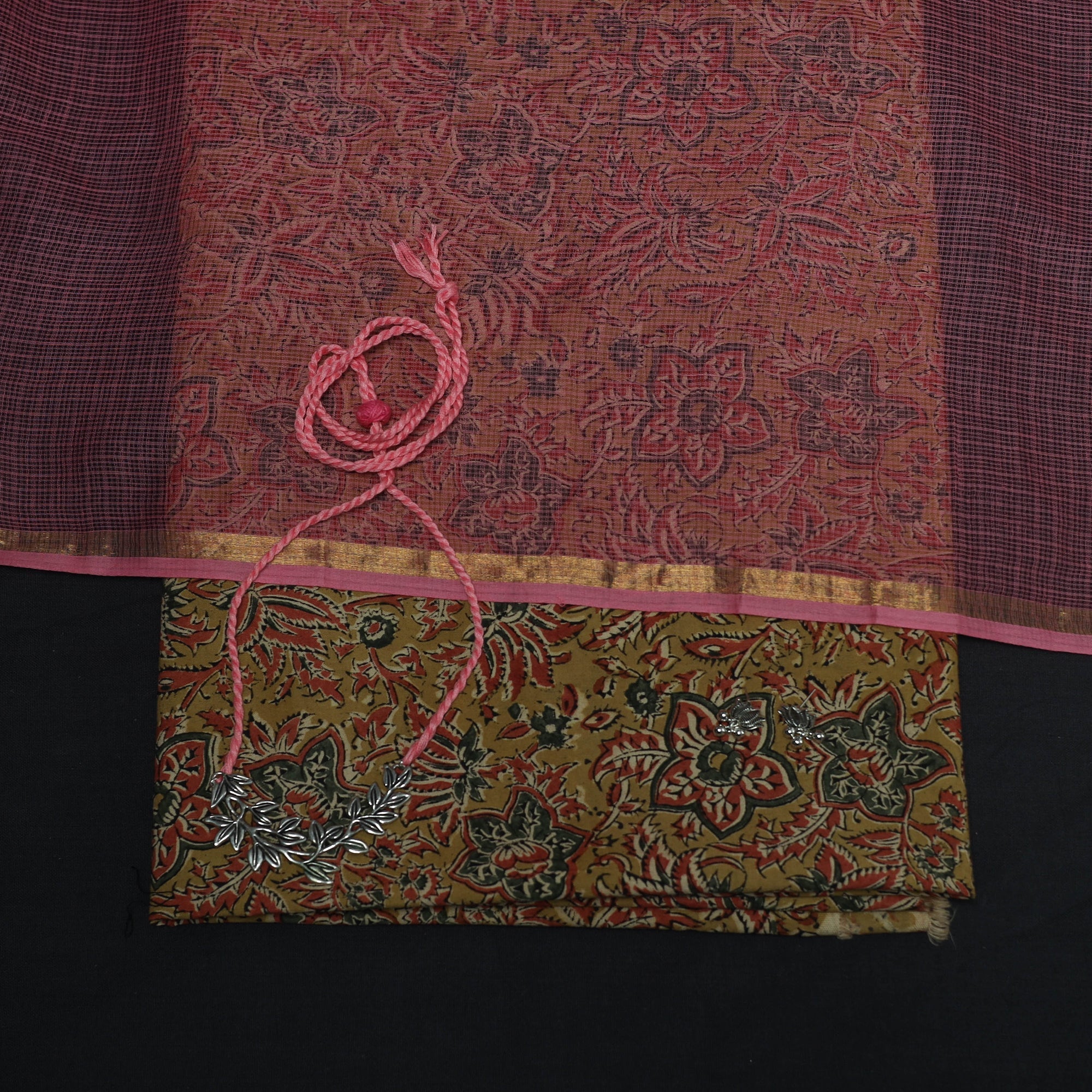 Pedana Kalamkari Hand Block Print Natural Dyed Cotton 2pc Unstitched Dress Material with Jewellery Set 18