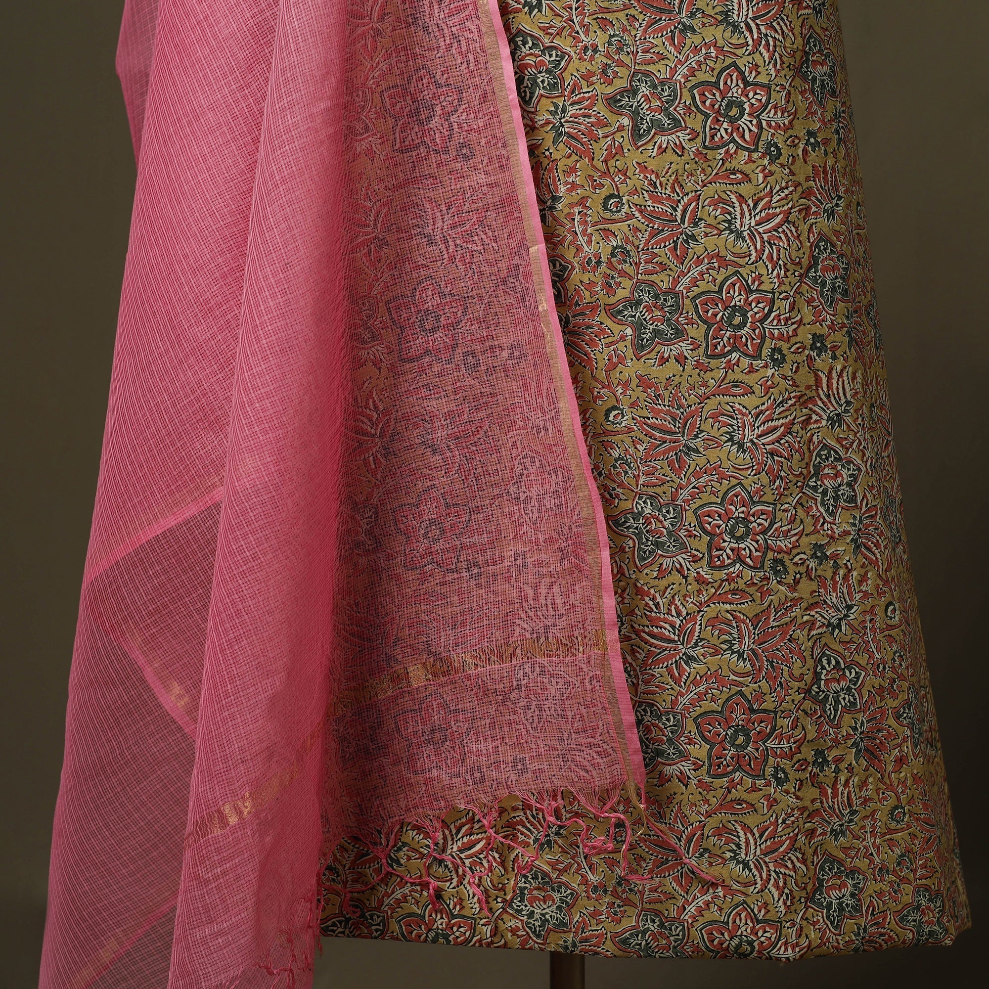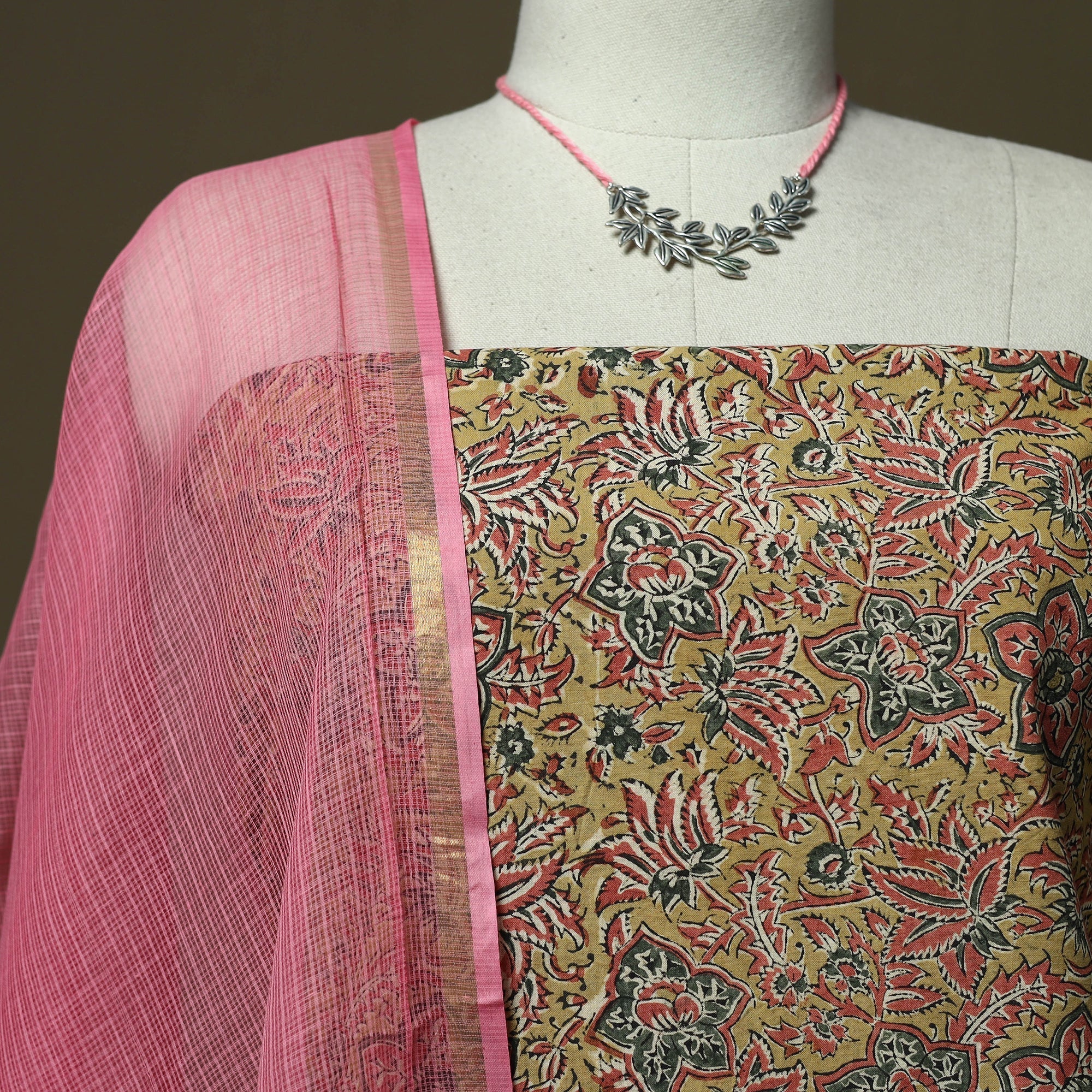 Kalamkari hand block print cotton 2pc unstitched dress material from Pedana, Andhra Pradesh, is created using one of the earliest and most intricate printing techniques, practiced by skilled artisans for over 3,000 years. The designs are developed using hand-carved wooden blocks and natural dyeing processes. Paired with a kota doria cotton dupatta featuring a zari border, kota doria is an age-old Indian textile produced in the Kota district of Rajasthan. The doria or the threads are finely interweaves to make the check patterns. Its lightweight and sheer texture giving an exquisite grace and elegance of its own. This set also includes a handcrafted matching necklace and earrings to complete your look. It is suitable for family gatherings, traditional events and special occasions.