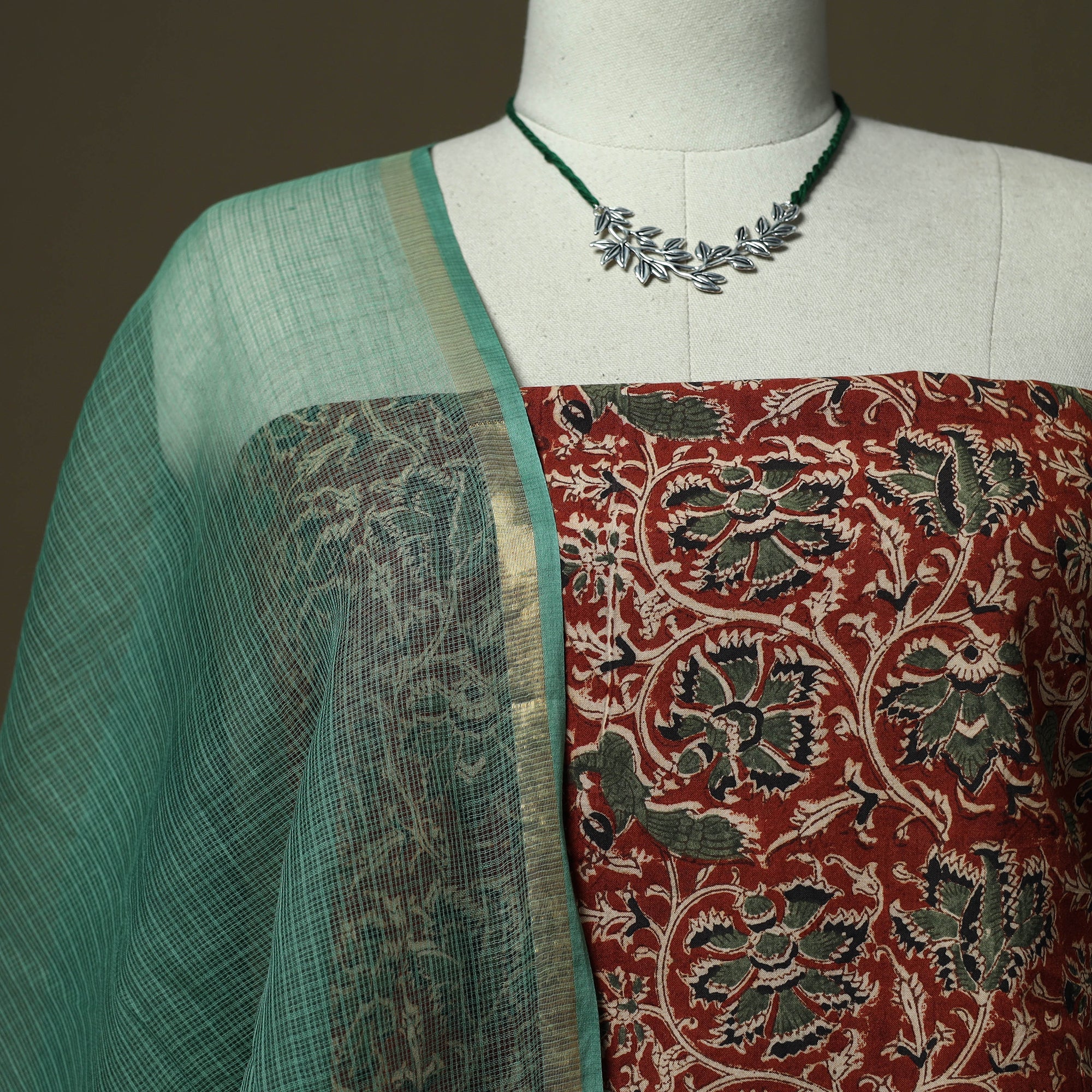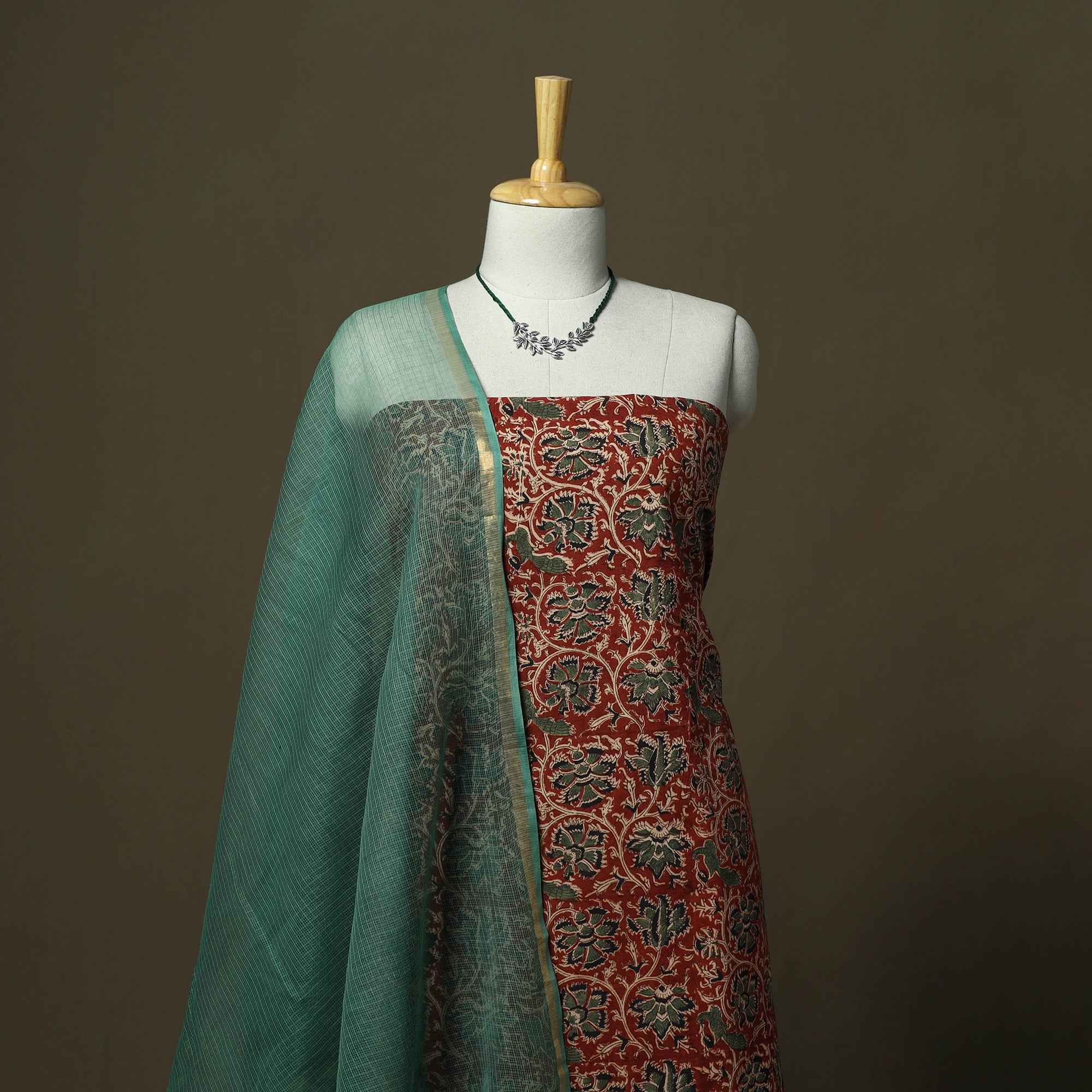 Kalamkari hand block print cotton 2pc unstitched dress material from Pedana, Andhra Pradesh, is created using one of the earliest and most intricate printing techniques, practiced by skilled artisans for over 3,000 years. The designs are developed using hand-carved wooden blocks and natural dyeing processes. Paired with a kota doria cotton dupatta featuring a zari border, kota doria is an age-old Indian textile produced in the Kota district of Rajasthan. The doria or the threads are finely interweaves to make the check patterns. Its lightweight and sheer texture giving an exquisite grace and elegance of its own. This set also includes a handcrafted matching necklace and earrings to complete your look. It is suitable for family gatherings, traditional events and special occasions.