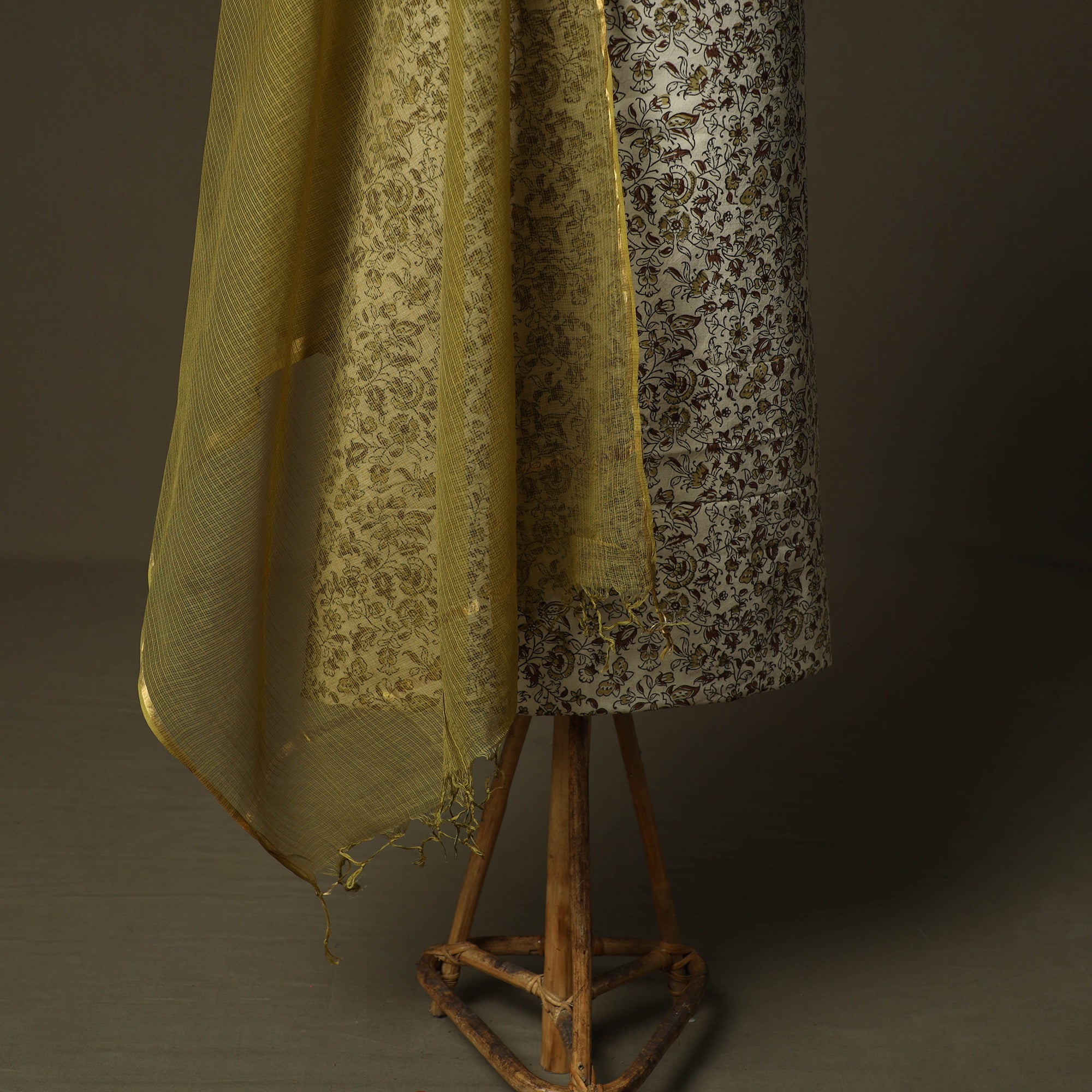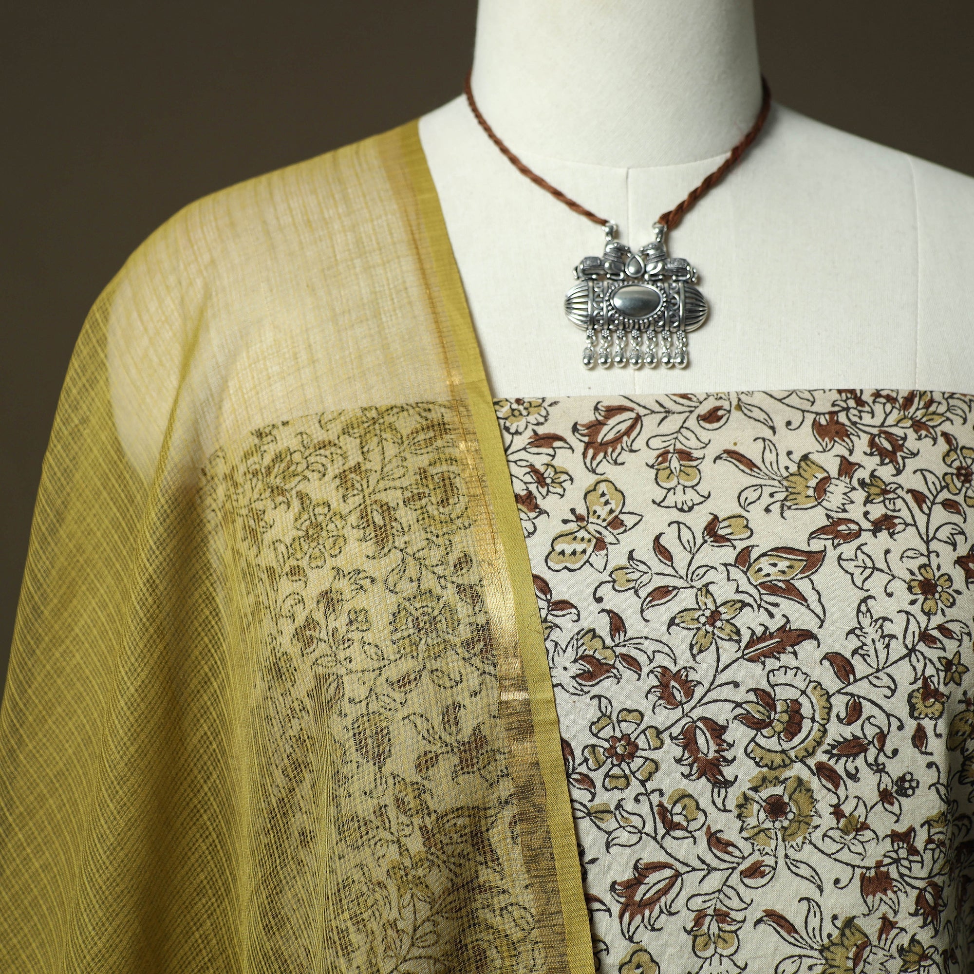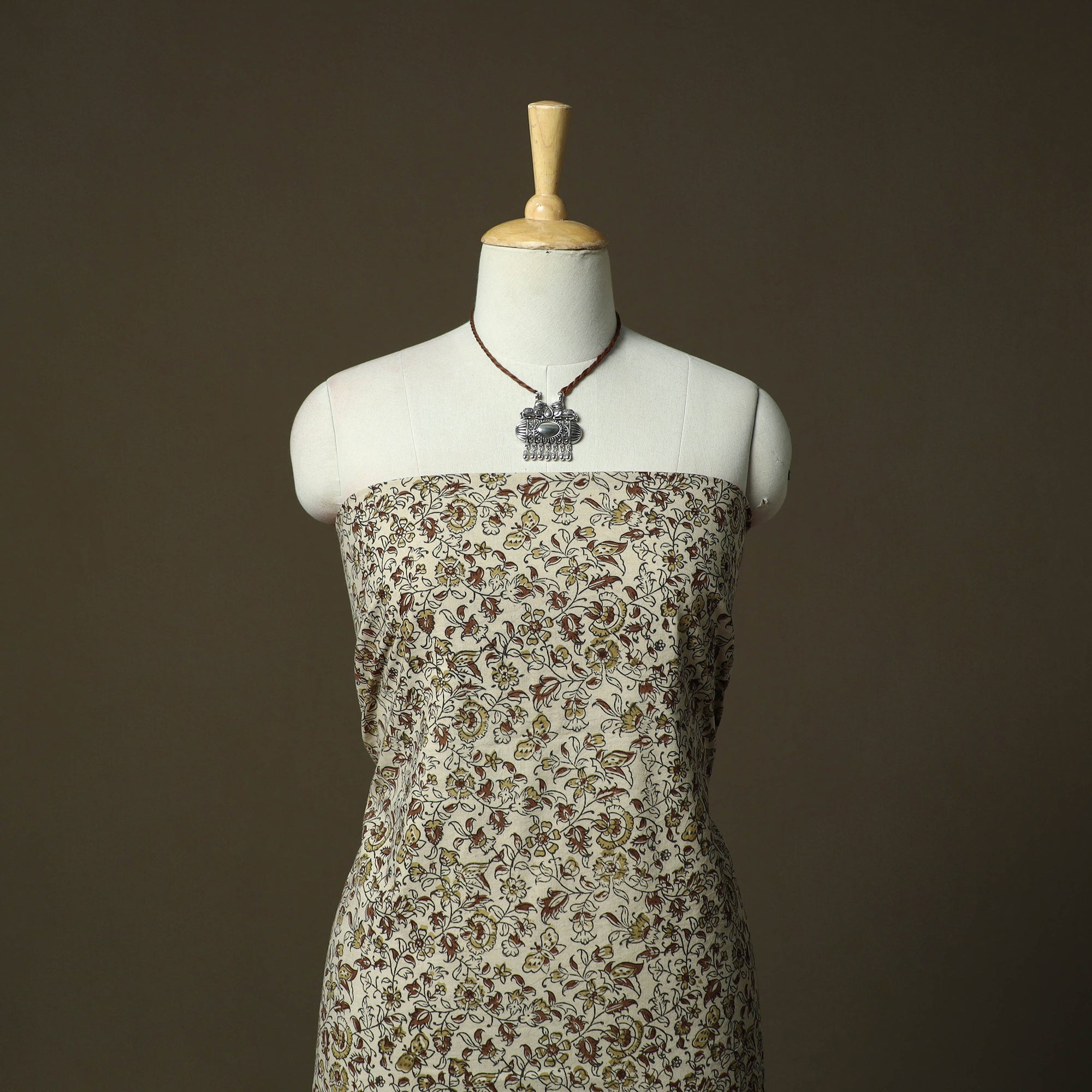 | Material | Beige kalamkari hand block print cotton 2pc unstitched dress material from Pedana, Andhra Pradesh, is created using one of the earliest and most intricate printing techniques, practiced by skilled artisans for over 3,000 years. The designs are developed using hand-carved wooden blocks and natural dyeing processes. Paired with a kota doria cotton dupatta featuring a zari border, kota doria is an age-old Indian textile produced in the Kota district of Rajasthan. The doria or the threads are finely interweaves to make the check patterns. Its lightweight and sheer texture giving an exquisite grace and elegance of its own. This set also includes a handcrafted matching necklace and earrings to complete your look. It is suitable for family gatherings, traditional events and special occasions. A Note on Handmade Beauty: |