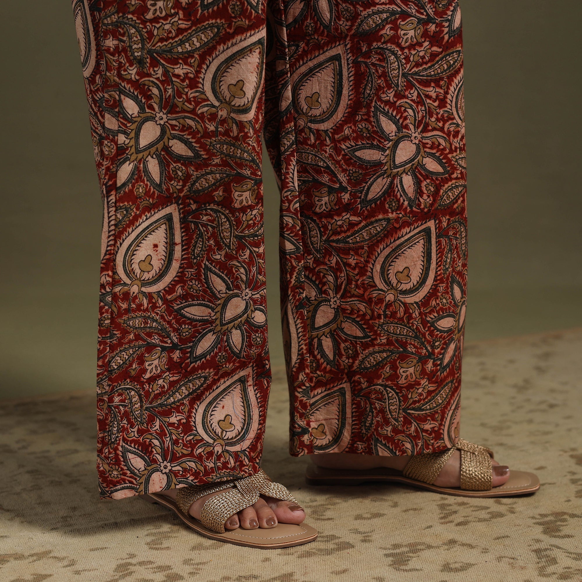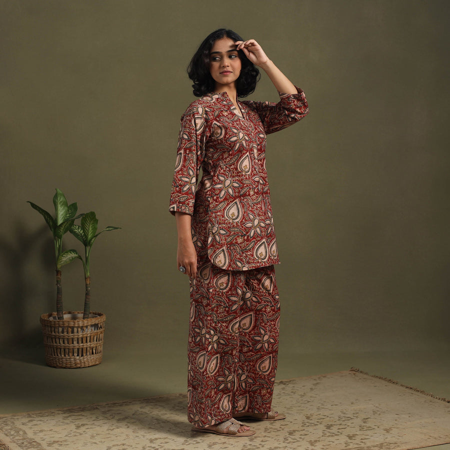 Stay stylish in our red kalamkari co-ord set, crafted using the traditional hand block printing technique from Pedana. Made from naturally dyed, breathable cotton, this two-piece outfit features an elasticated waist palazzo with pockets and a chic top. Each piece reflects the rich heritage of kalamkari artistry. Whether you're lounging at home, stepping out for brunch, or heading to a casual gathering, it blends comfort, culture, and modern style seamlessly.