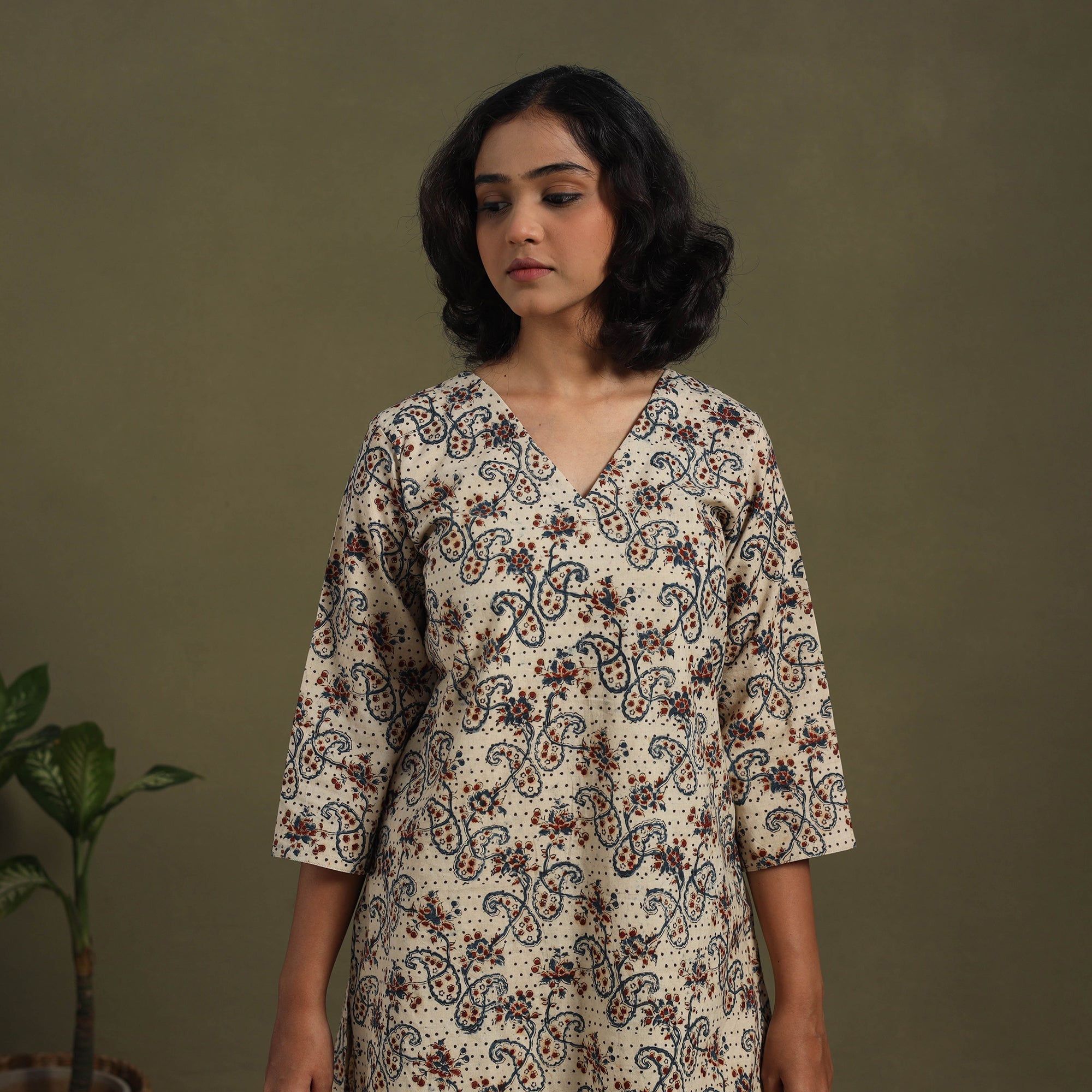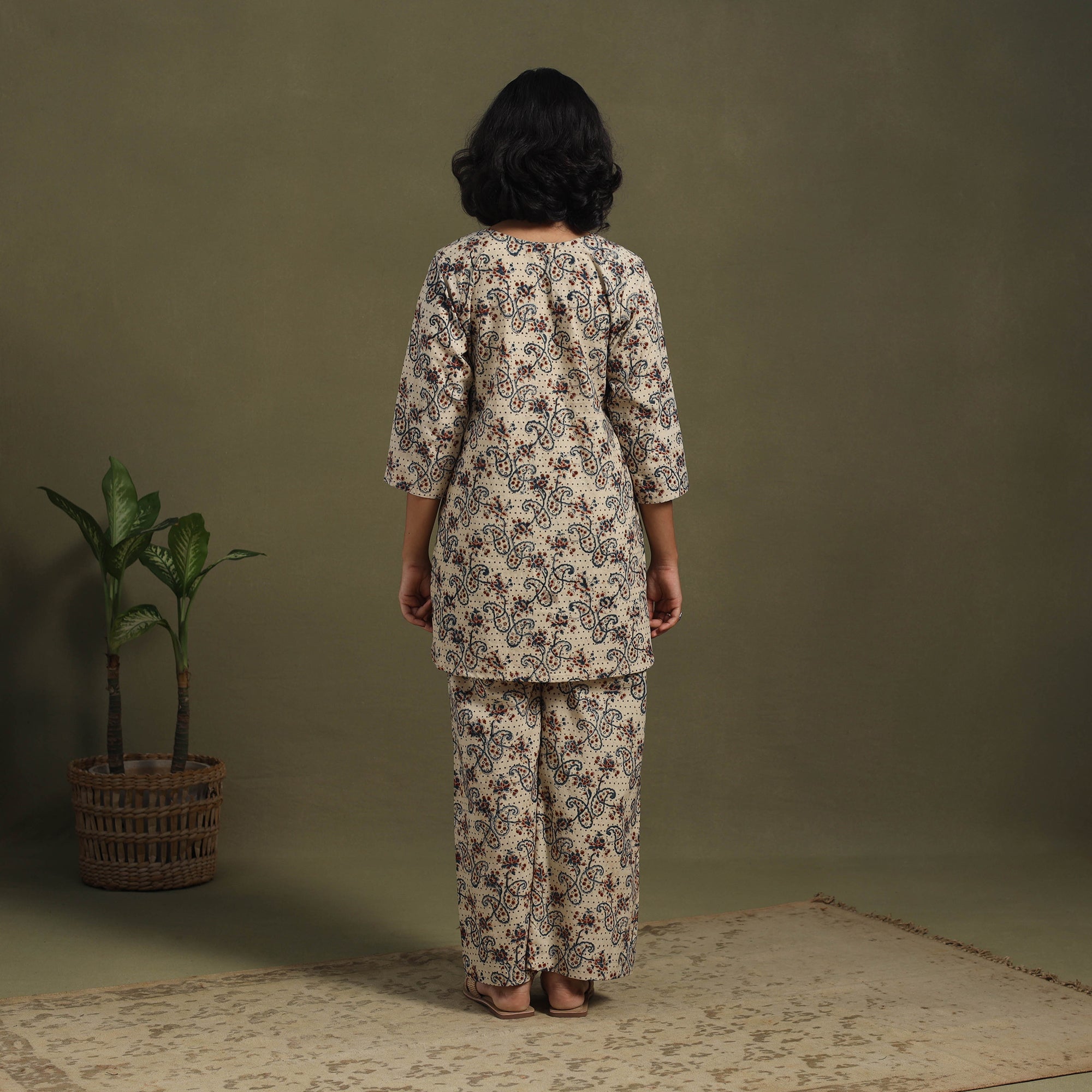 Stay stylish in our beige kalamkari co-ord set, crafted using the traditional hand block printing technique from Pedana. Made from naturally dyed, breathable cotton, this two-piece outfit features an elasticated waist palazzo with pockets and a chic top. Each piece reflects the rich heritage of kalamkari artistry. Whether you're lounging at home, stepping out for brunch, or heading to a casual gathering, it blends comfort, culture, and modern style seamlessly.