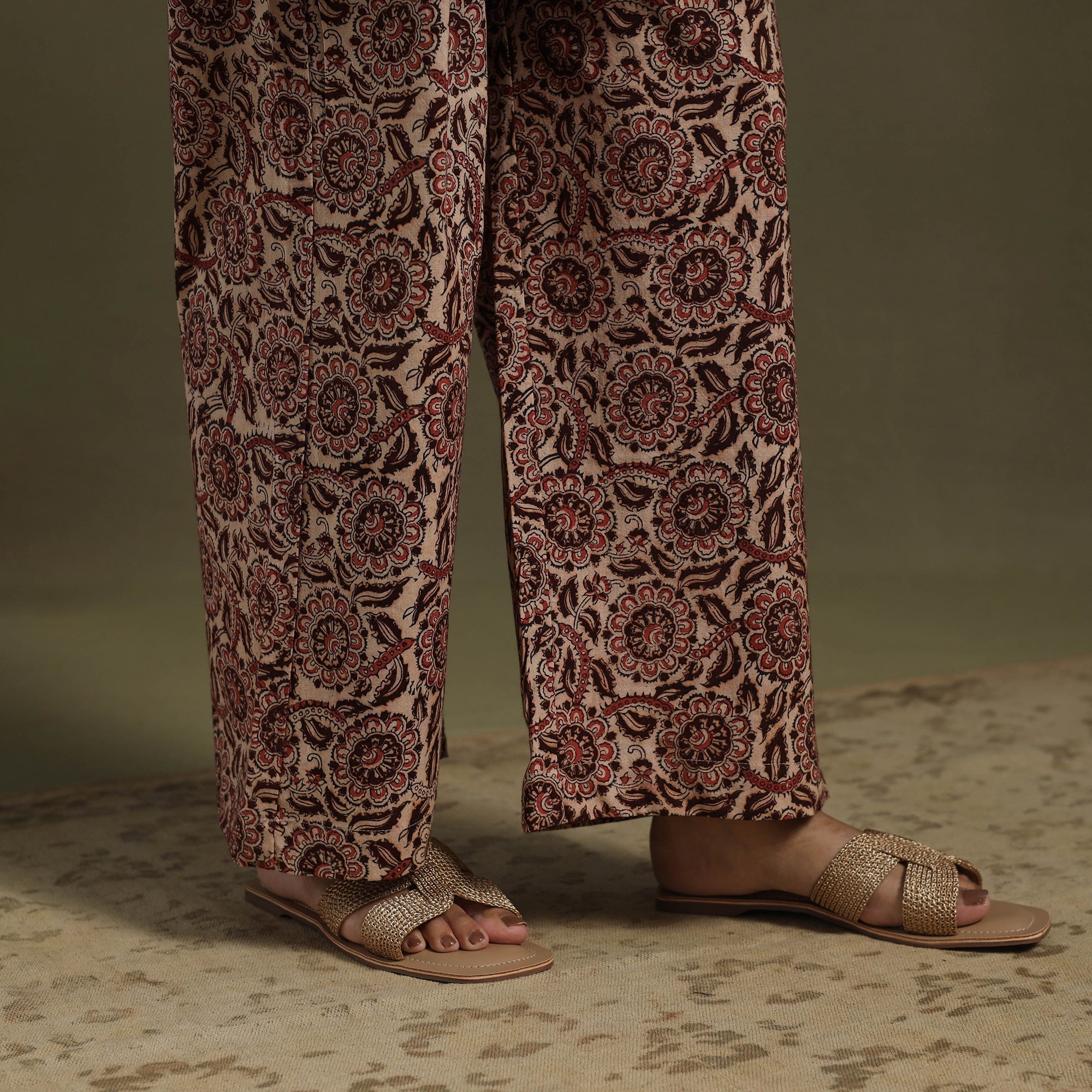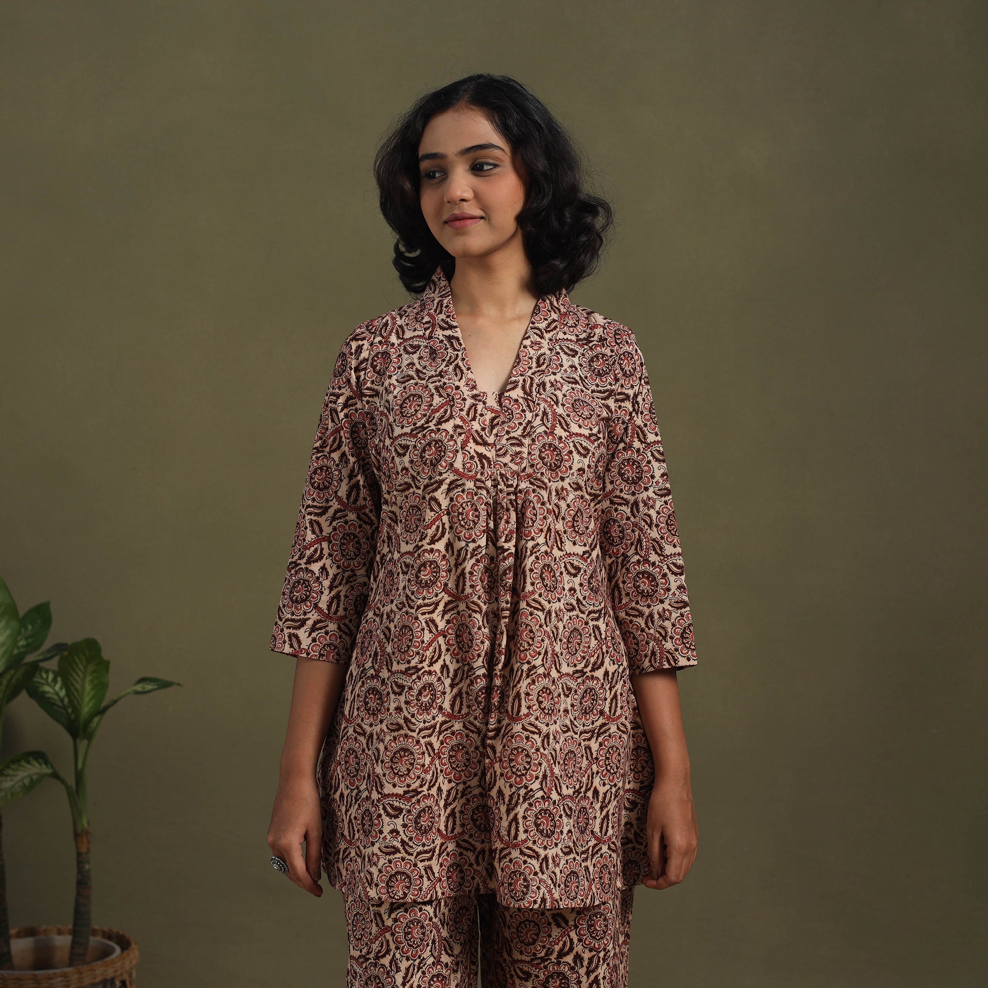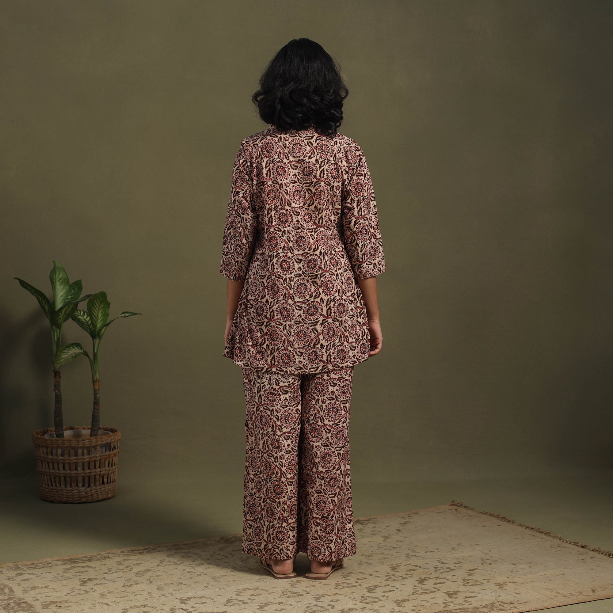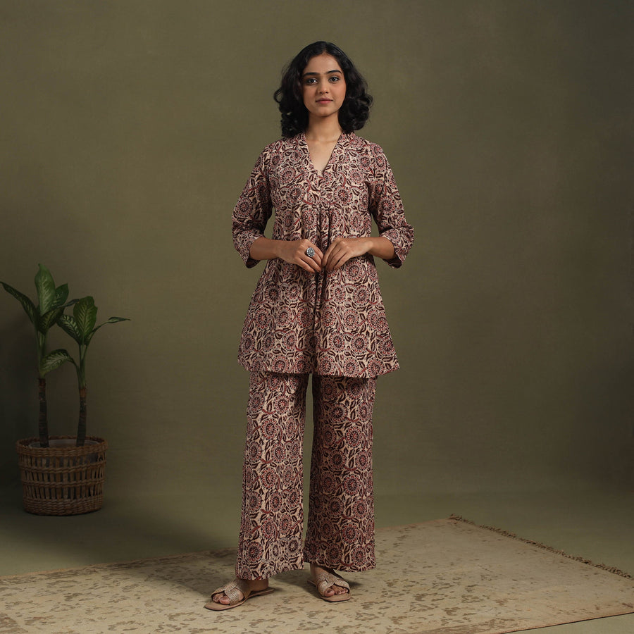 Stay stylish in our beige kalamkari co-ord set, crafted using the traditional hand block printing technique from Pedana. Made from naturally dyed, breathable cotton, this two-piece outfit features an elasticated waist palazzo with pockets and a chic top. Each piece reflects the rich heritage of kalamkari artistry. Whether you're lounging at home, stepping out for brunch, or heading to a casual gathering, it blends comfort, culture, and modern style seamlessly.