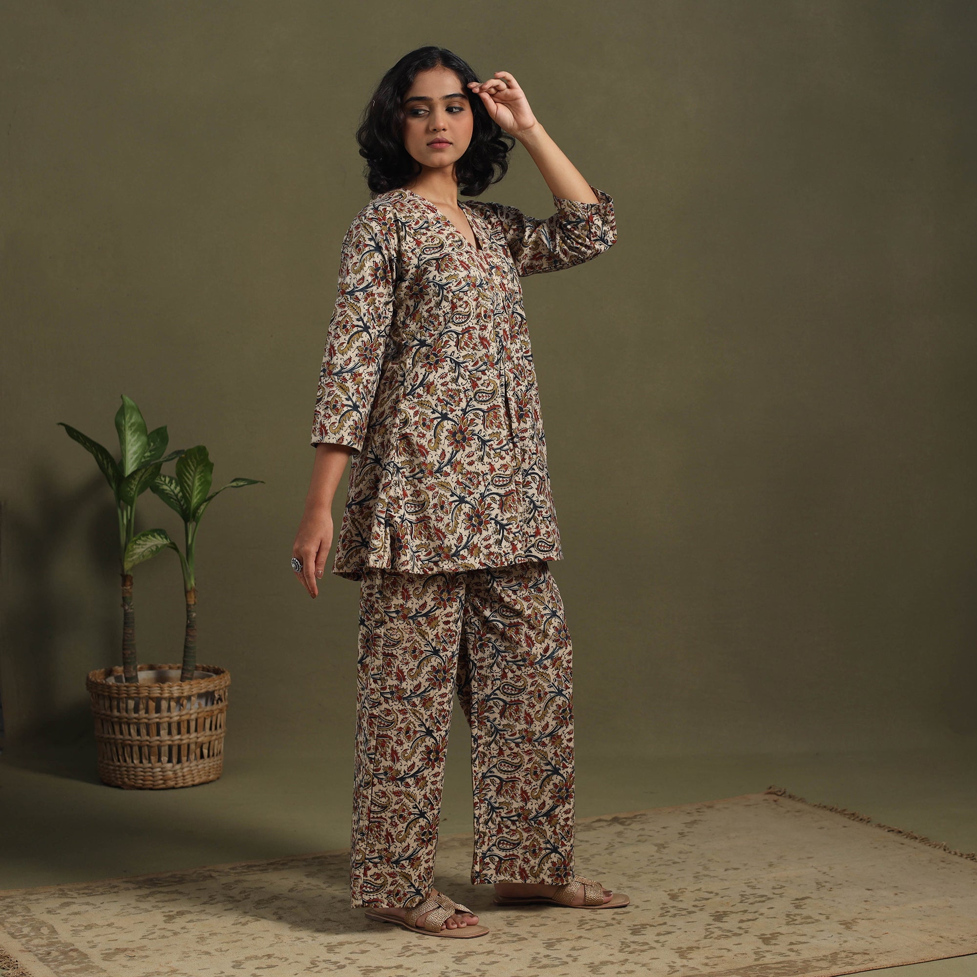Stay stylish in our beige kalamkari co-ord set, crafted using the traditional hand block printing technique from Pedana. Made from naturally dyed, breathable cotton, this two-piece outfit features an elasticated waist palazzo with pockets and a chic top. Each piece reflects the rich heritage of kalamkari artistry. Whether you're lounging at home, stepping out for brunch, or heading to a casual gathering, it blends comfort, culture, and modern style seamlessly.