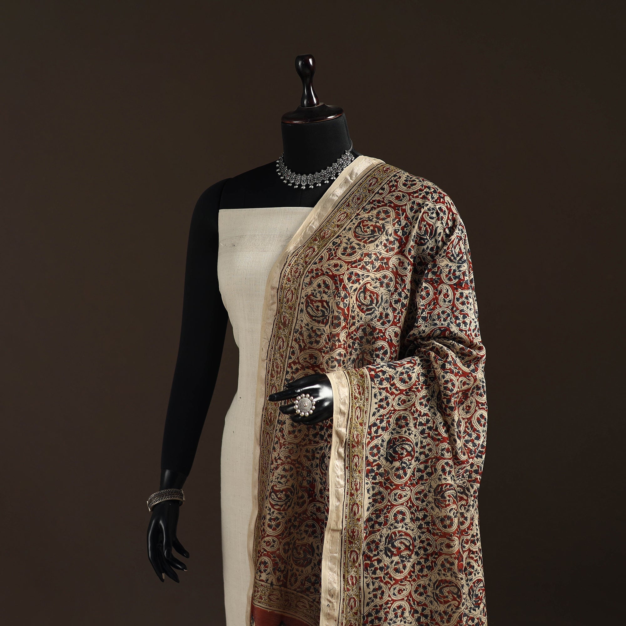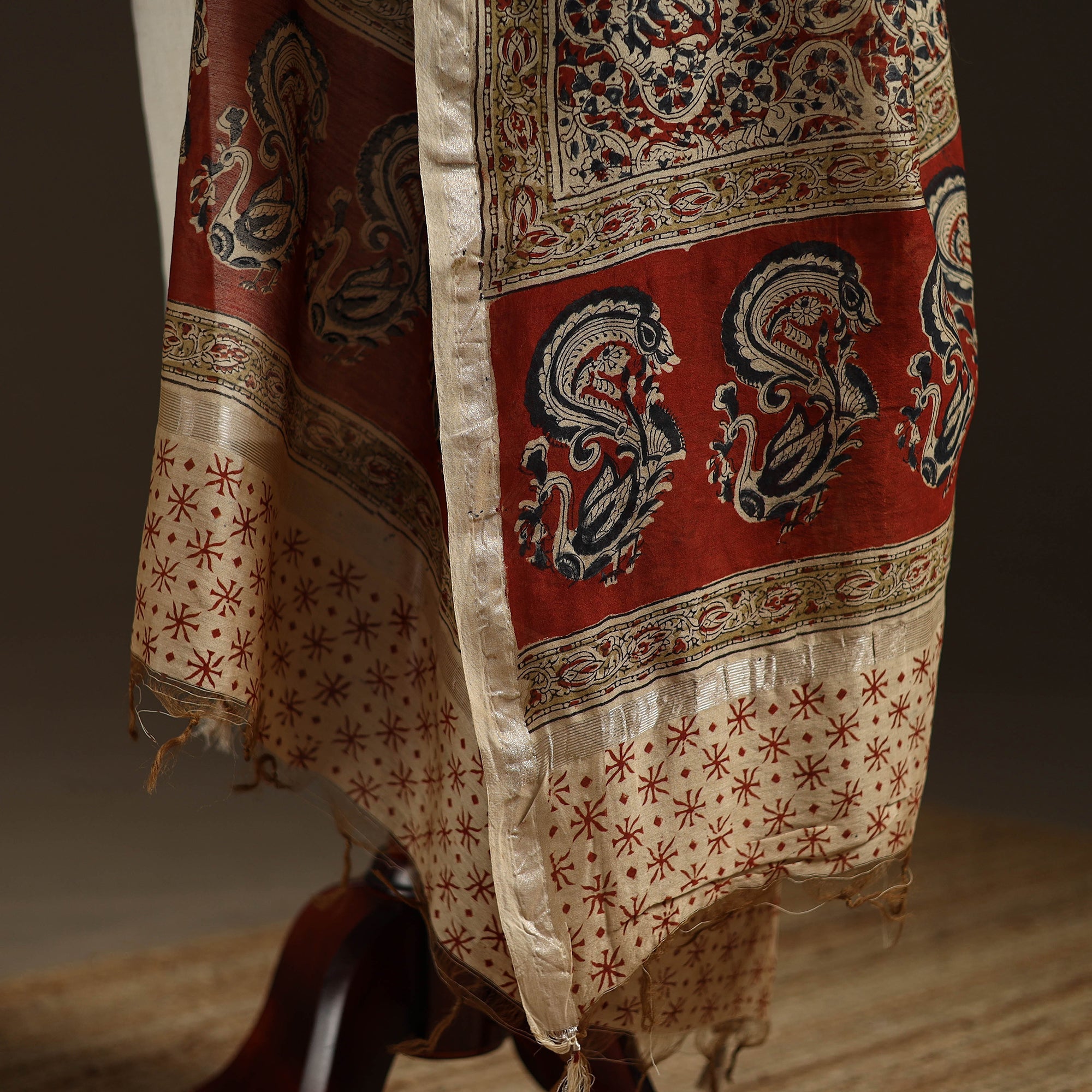 This block printed kalamkari chanderi silk cotton dupatta is crafted in Pedana by skilled artisans using traditional wooden blocks. The intricate motifs are created with natural dyes, reflecting the authentic Kalamkari tradition of the region. Known for its fine detailing and rich heritage value, this dupatta pairs effortlessly with ethnic outfits, office wear, festive gatherings, and cultural occasions.