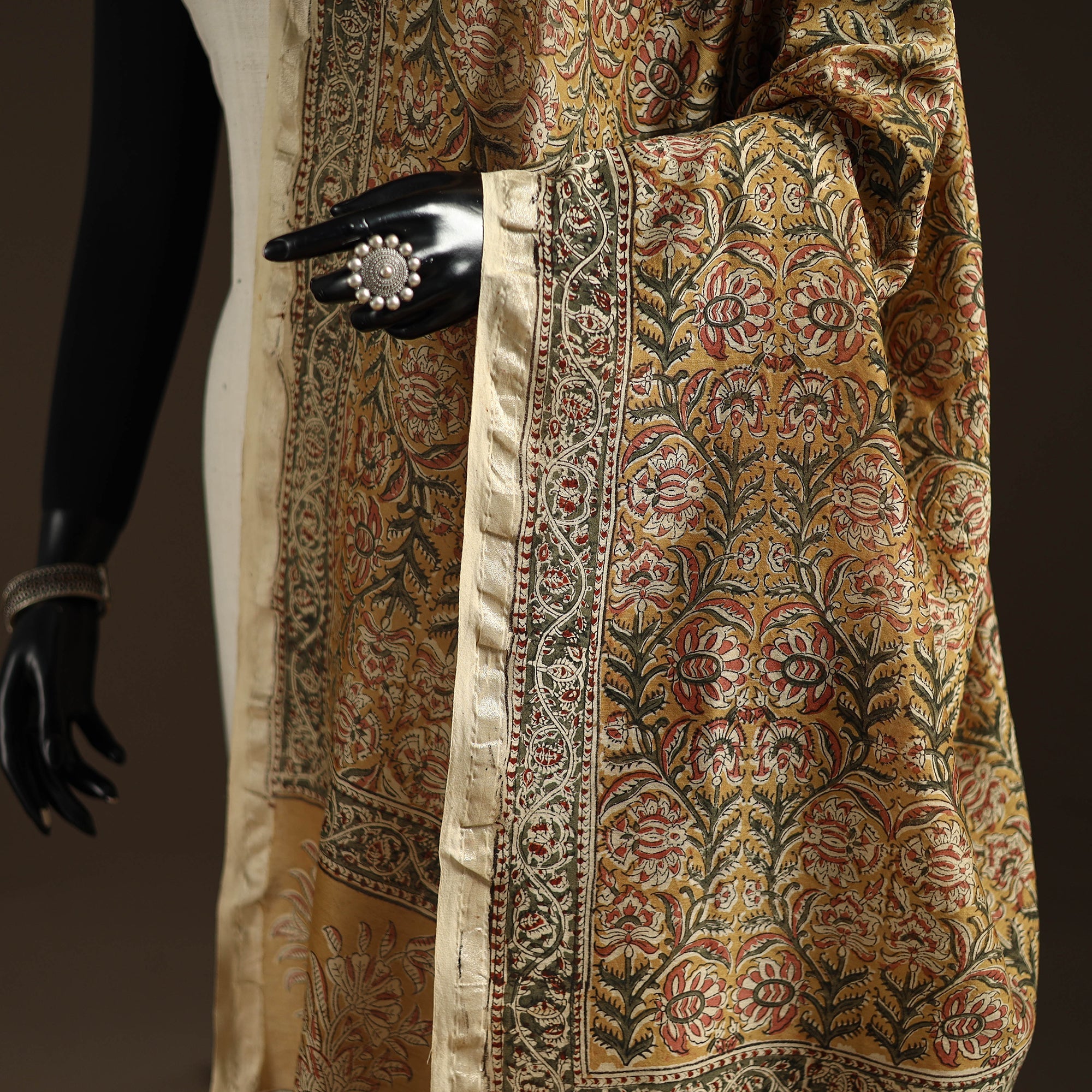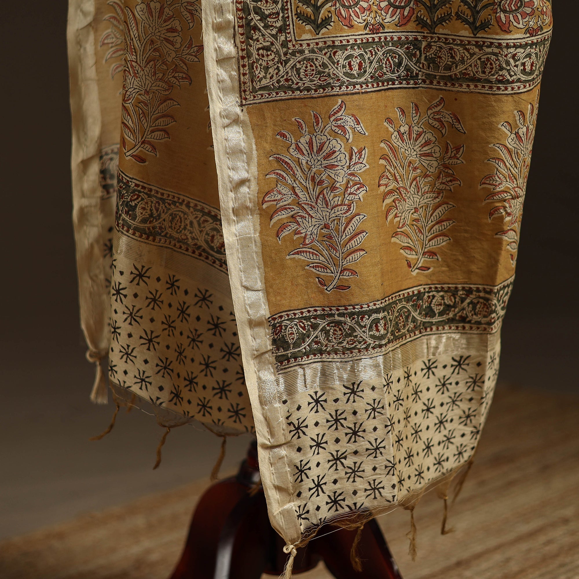 This block printed kalamkari chanderi silk cotton dupatta is crafted in Pedana by skilled artisans using traditional wooden blocks. The intricate motifs are created with natural dyes, reflecting the authentic Kalamkari tradition of the region. Known for its fine detailing and rich heritage value, this dupatta pairs effortlessly with ethnic outfits, office wear, festive gatherings, and cultural occasions.