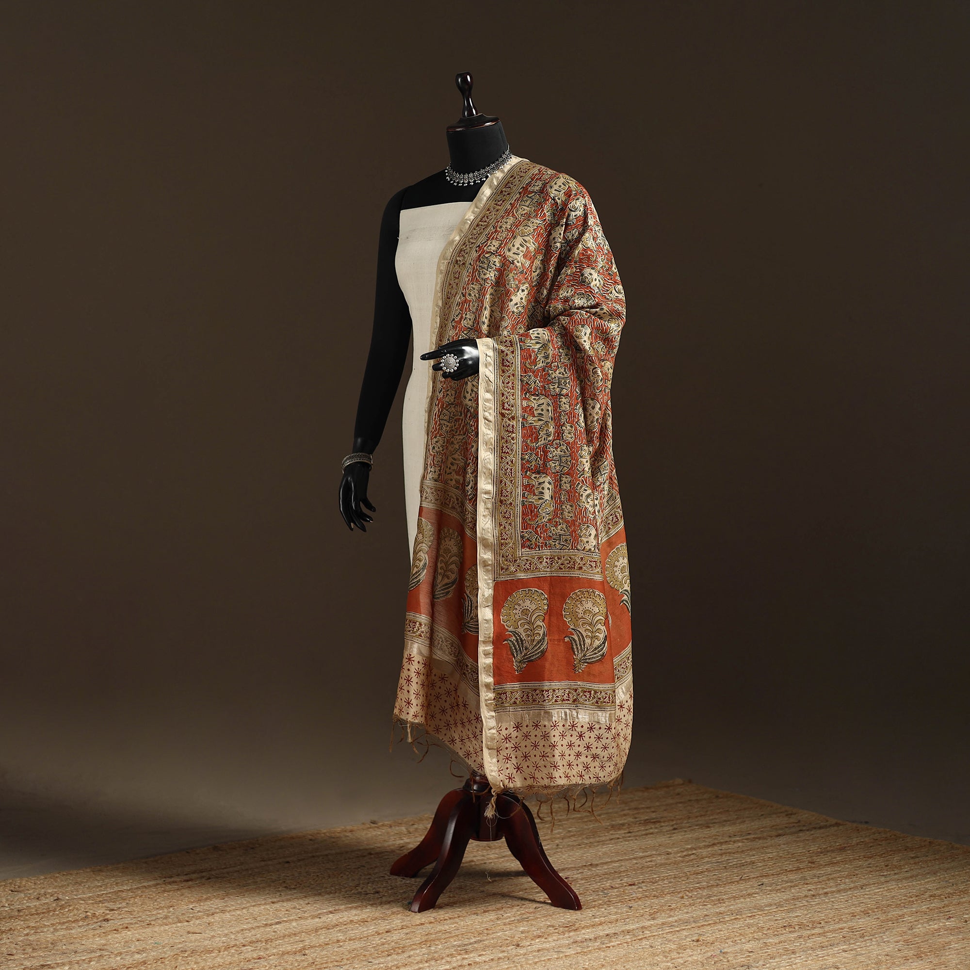 Orange - Pedana Natural Dyed Hand Block Print Kalamkari Dupatta in Chanderi Silk 37