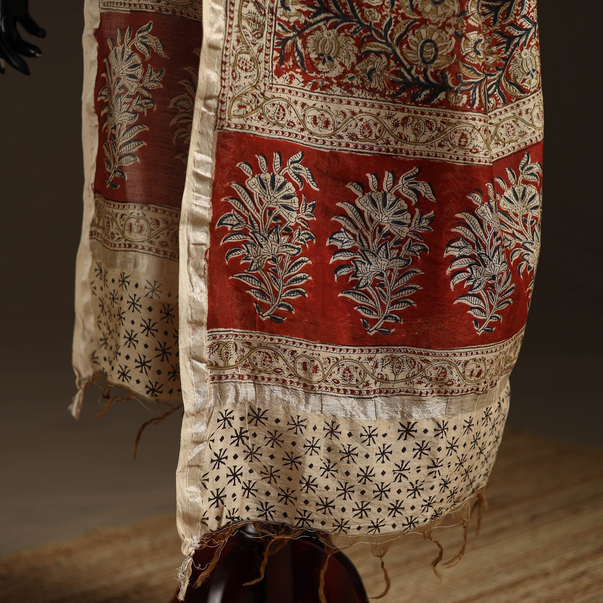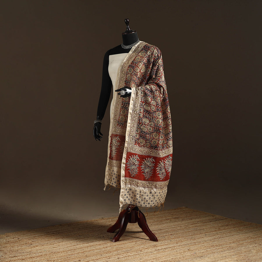 This block printed kalamkari chanderi silk cotton dupatta is crafted in Pedana by skilled artisans using traditional wooden blocks. The intricate motifs are created with natural dyes, reflecting the authentic Kalamkari tradition of the region. Known for its fine detailing and rich heritage value, this dupatta pairs effortlessly with ethnic outfits, office wear, festive gatherings, and cultural occasions.
