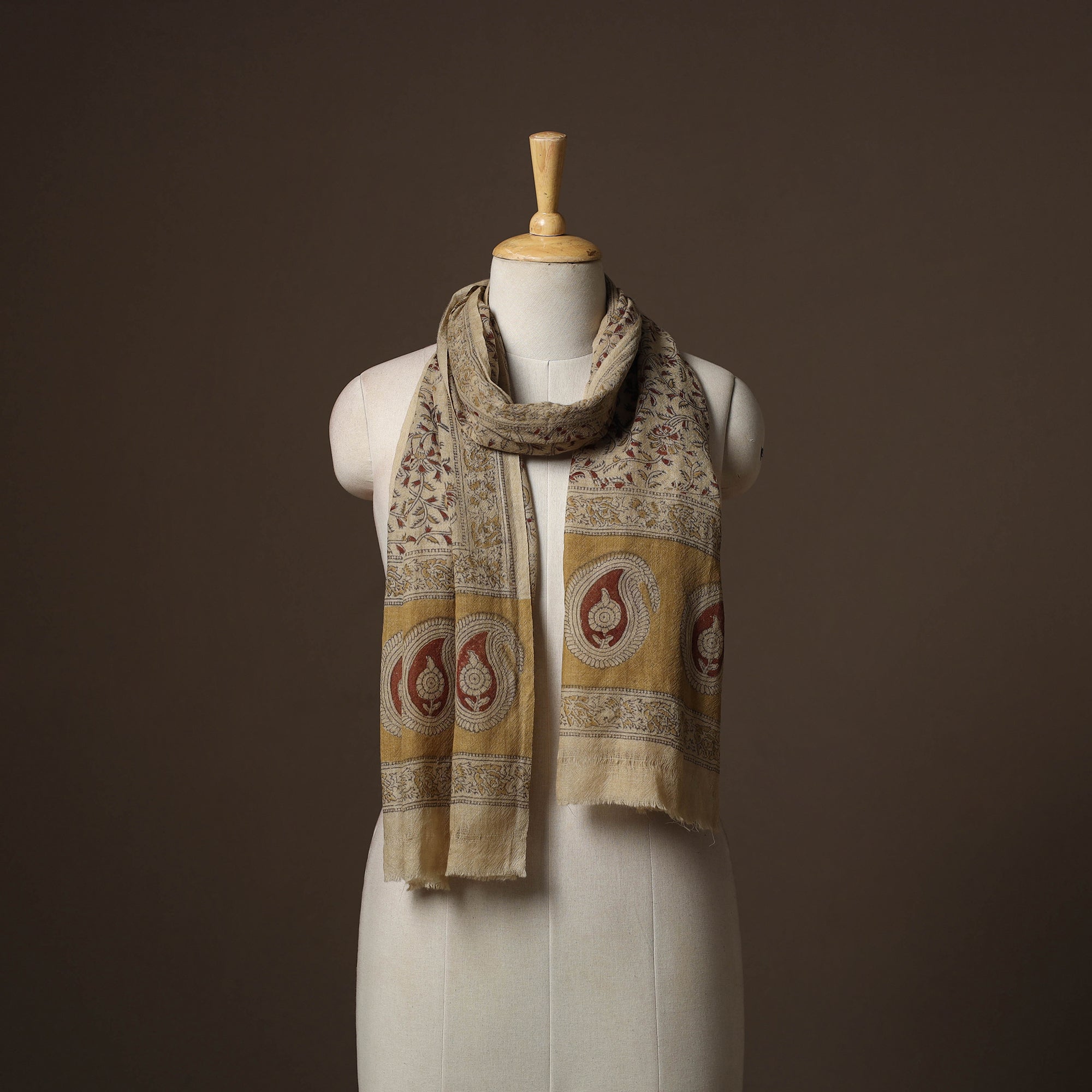 Yellow pedana hand block print pure wool kalamkari stole adds a refined touch to your winter wardrobe. This exquisite stole is adorned with intricate hand block printed designs using natural dyes, an identification of authentic Kalamkari artistry. The pure wool construction offers exceptional warmth and softness, making it perfect for cold weather. This exquisite stole can elevate any outfit. It's versatile, suitable for both formal and casual occasions, adding a touch of traditional Indian artistry to your style.