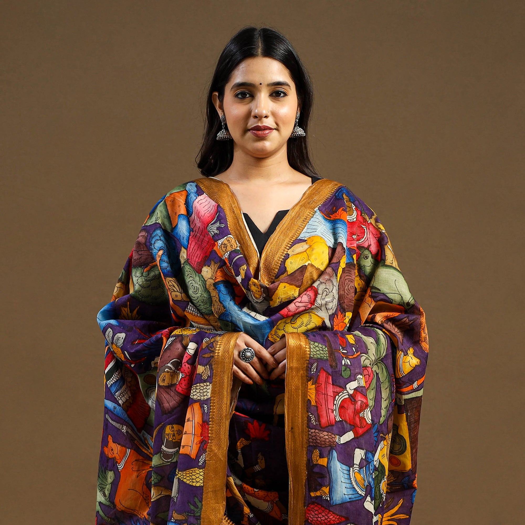 This multicolor handloom pen-work Kalamkari dupatta is hand-painted on Chanderi silk using the traditional Srikalahasti technique from Andhra Pradesh. Made with natural dyes and drawn freehand by skilled artisans, it features intricate motifs inspired by age-old stories and symbols. Adorned with a zari border and tassels, ideal for festive occasions, family functions, or for those who embrace heritage in their personal style.