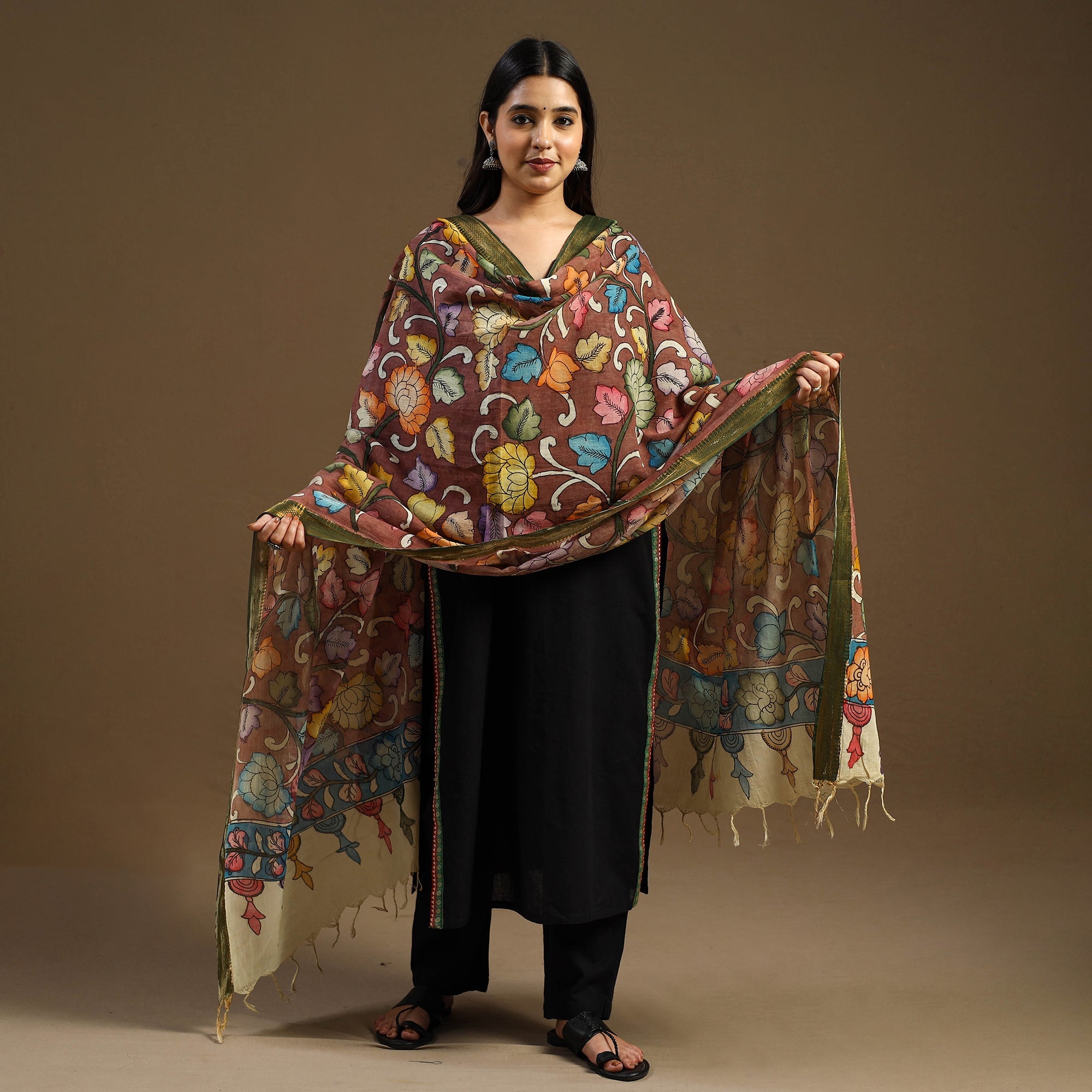 This brown handloom pen-work Kalamkari dupatta is hand-painted on Chanderi silk using the traditional Srikalahasti technique from Andhra Pradesh. Made with natural dyes and drawn freehand by skilled artisans, it features intricate motifs inspired by age-old stories and symbols. Adorned with a zari border and tassels, ideal for festive occasions, family functions, or for those who embrace heritage in their personal style.