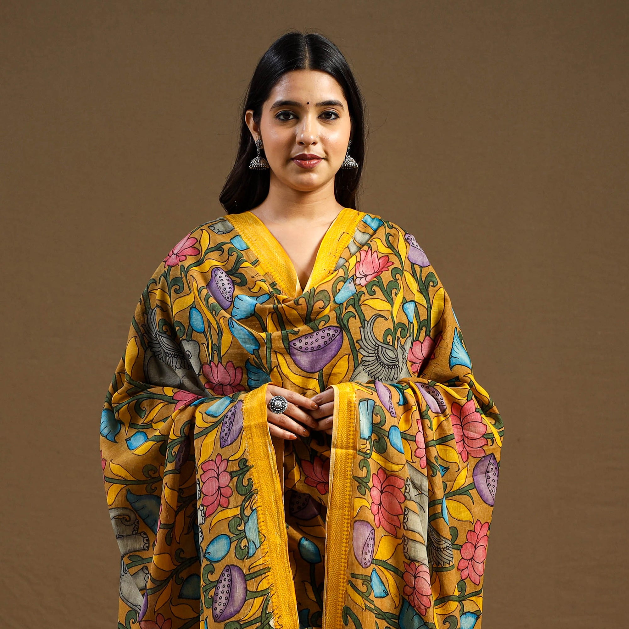 This orange handloom pen-work Kalamkari dupatta is hand-painted on Chanderi silk using the traditional Srikalahasti technique from Andhra Pradesh. Made with natural dyes and drawn freehand by skilled artisans, it features intricate motifs inspired by age-old stories and symbols. Adorned with a zari border and tassels, ideal for festive occasions, family functions, or for those who embrace heritage in their personal style.