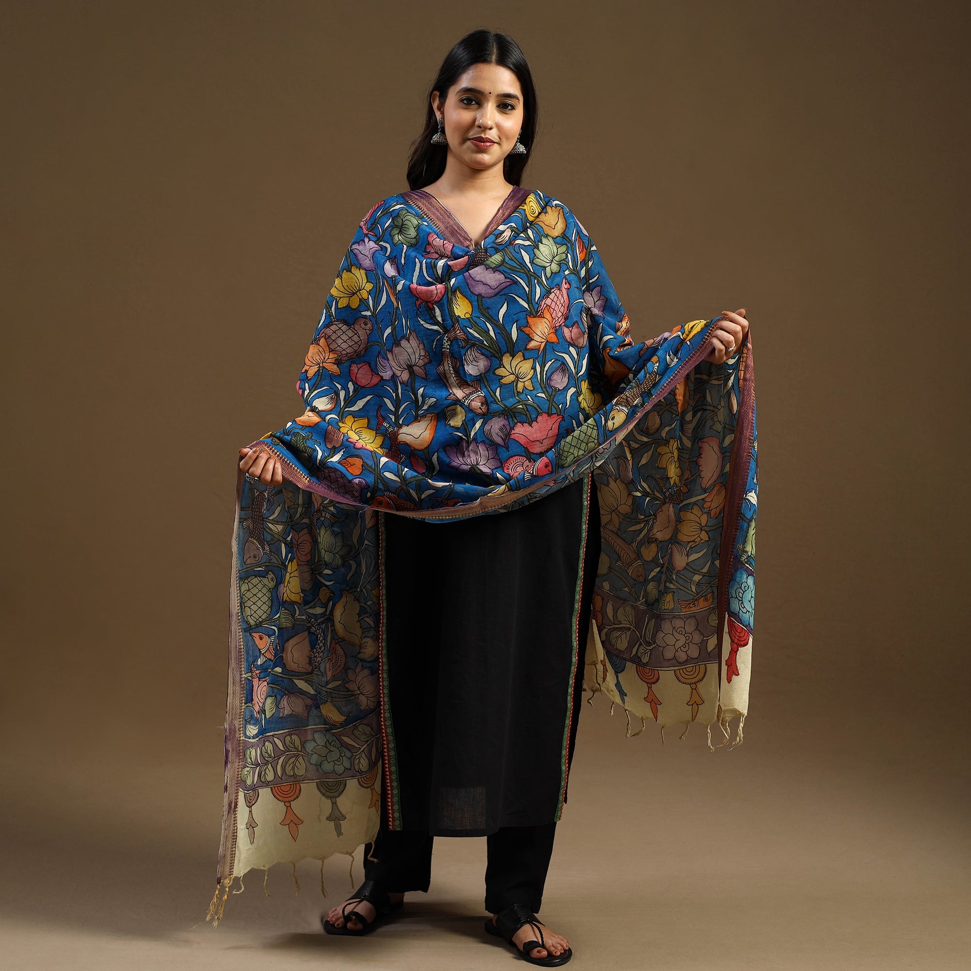 This blue handloom pen-work Kalamkari dupatta is hand-painted on Chanderi silk using the traditional Srikalahasti technique from Andhra Pradesh. Made with natural dyes and drawn freehand by skilled artisans, it features intricate motifs inspired by age-old stories and symbols. Adorned with a zari border and tassels, ideal for festive occasions, family functions, or for those who embrace heritage in their personal style.